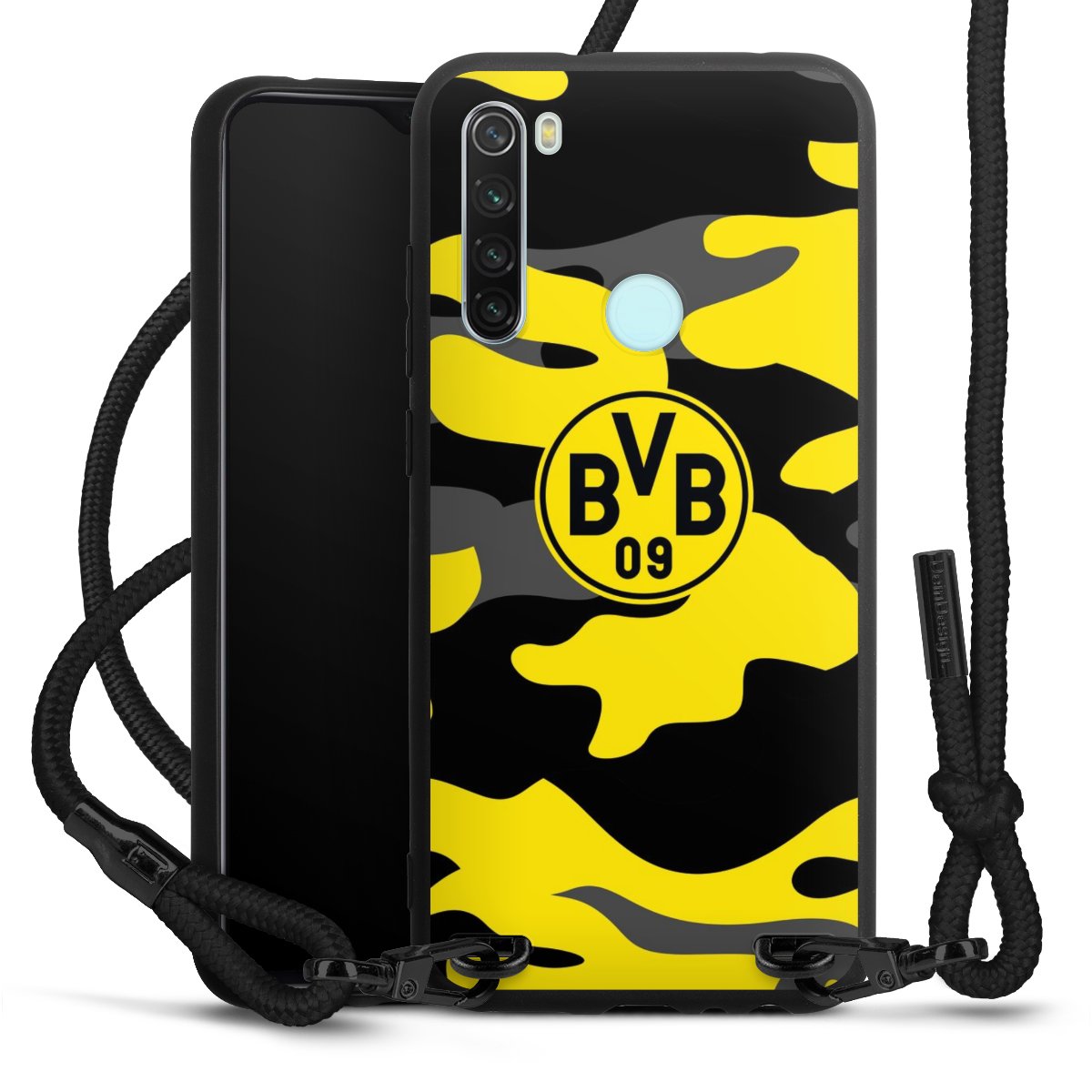 The matt black silicone case is made of flexible TPU (thermoplastic polyurethane) and offers robust protection. The durable, unbreakable material makes the cover flexible and dimensionally stable at the same time. The matte surface makes your design stand out more and is less susceptible to fingerprints and dirt. The stylish trend accessory fits comfortably in the hand and is perfectly complemented by the fabric (polyester) mobile phone strap. The braided fabric strap is approx. 1.70 metres long with a diameter of approx. 0.5 cm. Due to the special knotting technique, the length of the strap can be adjusted by simply pulling it, so that you can adapt it individually to your wishes. The practical case to wear around your neck is available with the fabric strap in black. As a little icing on the cake, we have provided the strap with a chic metal fastener in matt black. The strap is securely fastened to the case with loops made of high-quality genuine leather and press studs. The ends of the fabric strap are covered with metallic end caps and thus protected from fraying.