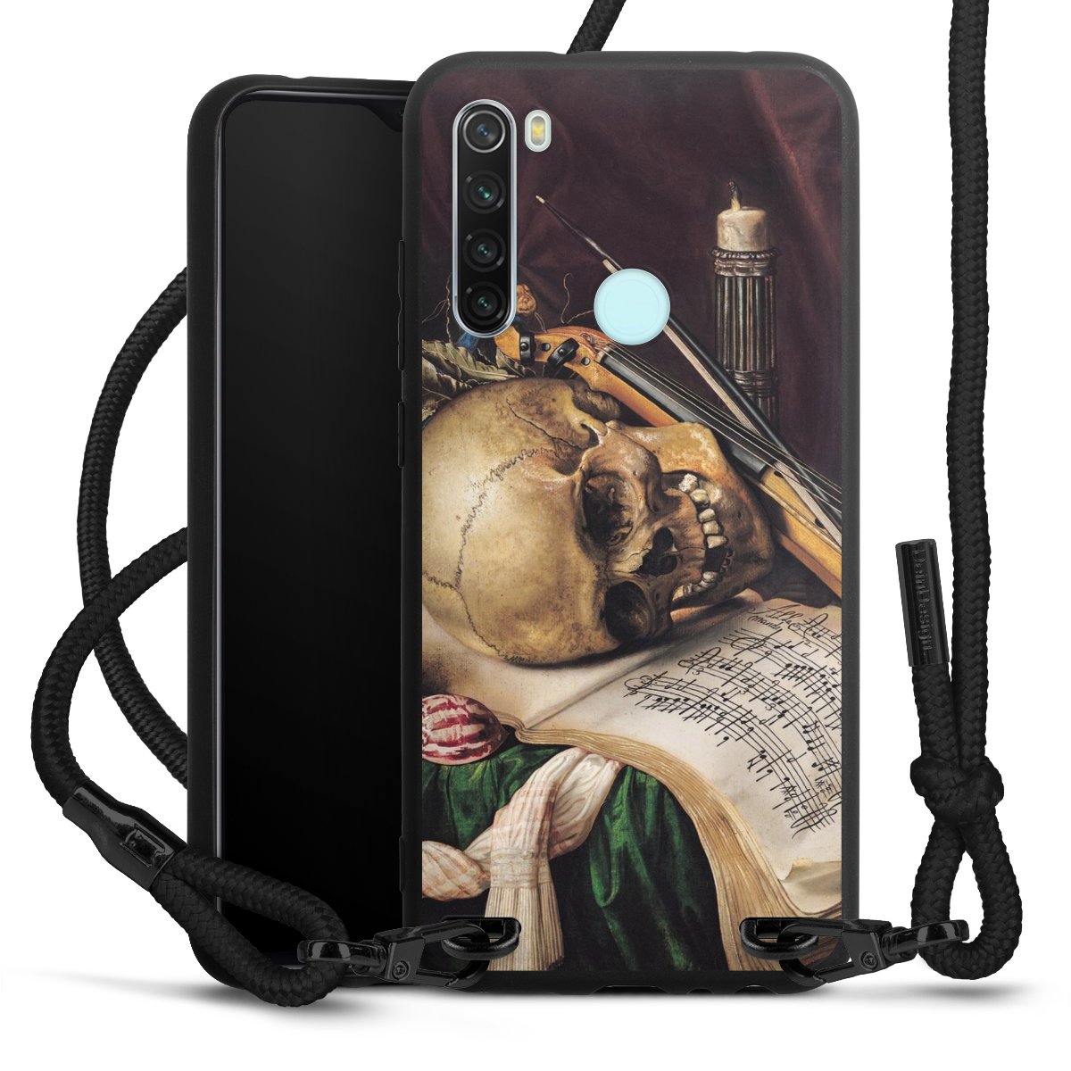 The matt black silicone case is made of flexible TPU (thermoplastic polyurethane) and offers robust protection. The durable, unbreakable material makes the cover flexible and dimensionally stable at the same time. The matte surface makes your design stand out more and is less susceptible to fingerprints and dirt. The stylish trend accessory fits comfortably in the hand and is perfectly complemented by the fabric (polyester) mobile phone strap. The braided fabric strap is approx. 1.70 metres long with a diameter of approx. 0.5 cm. Due to the special knotting technique, the length of the strap can be adjusted by simply pulling it, so that you can adapt it individually to your wishes. The practical case to wear around your neck is available with the fabric strap in black. As a little icing on the cake, we have provided the strap with a chic metal fastener in matt black. The strap is securely fastened to the case with loops made of high-quality genuine leather and press studs. The ends of the fabric strap are covered with metallic end caps and thus protected from fraying.
