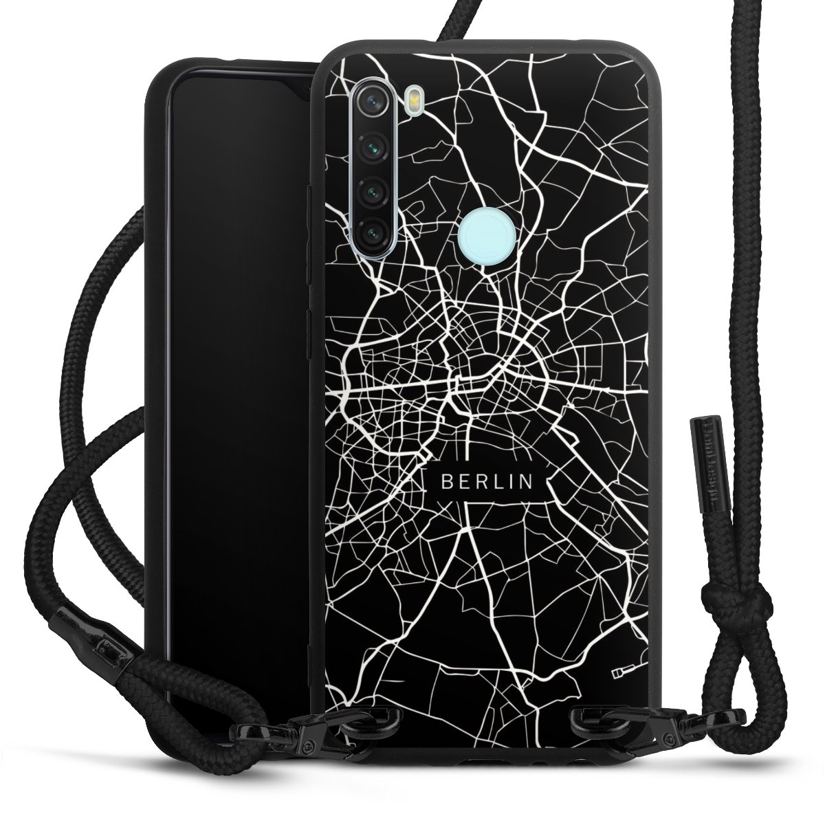 The matt black silicone case is made of flexible TPU (thermoplastic polyurethane) and offers robust protection. The durable, unbreakable material makes the cover flexible and dimensionally stable at the same time. The matte surface makes your design stand out more and is less susceptible to fingerprints and dirt. The stylish trend accessory fits comfortably in the hand and is perfectly complemented by the fabric (polyester) mobile phone strap. The braided fabric strap is approx. 1.70 metres long with a diameter of approx. 0.5 cm. Due to the special knotting technique, the length of the strap can be adjusted by simply pulling it, so that you can adapt it individually to your wishes. The practical case to wear around your neck is available with the fabric strap in black. As a little icing on the cake, we have provided the strap with a chic metal fastener in matt black. The strap is securely fastened to the case with loops made of high-quality genuine leather and press studs. The ends of the fabric strap are covered with metallic end caps and thus protected from fraying.