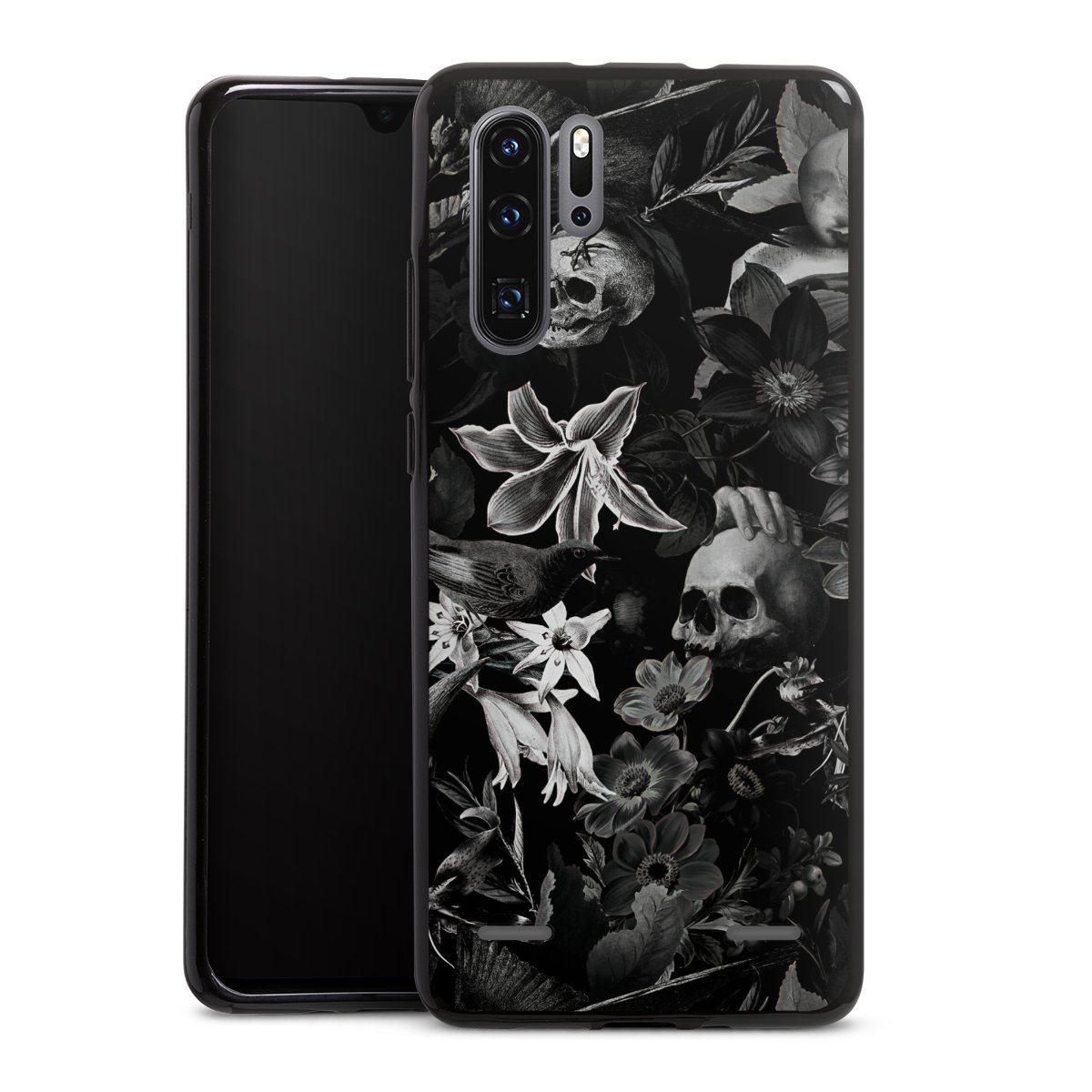 Skulls and Flowers on Black Background