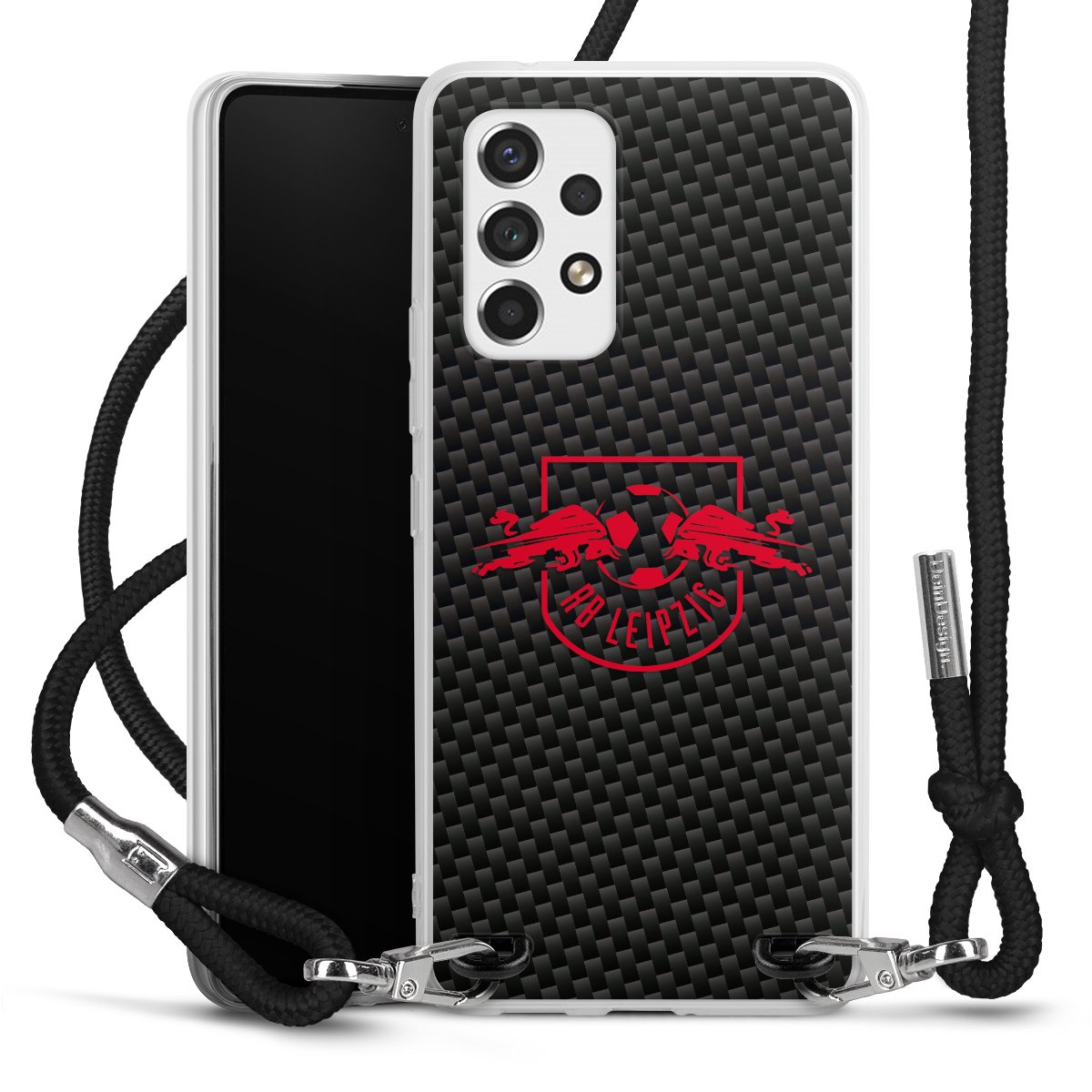 Red RB Leipzig logo on carbon look
