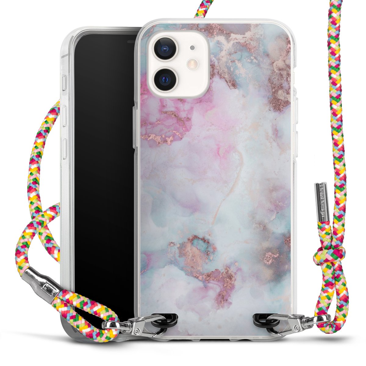 The flexible case is made from a highquality TPU material (thermoplastic Polyurethan). Thanks to its longlasting and break resistant characterisitcs, the case is flexible yet consistent in form and has a great grip and feel. The textile strap made from Polyester gives a chic yet casual accent allowing you to carry your phone like a bag or necklace - a practical gadget perfect for your next adventure. The textile strap is about 1.70 meters long and the length can easily be adjusted through the knots. Our Carry Case is available in Colourful, Mint-Camouflage, Very-Berry, Sahara-Sand and Sparkling-Neon. The ends of the textile strap are covered with metallic end caps to protect them against fraying.