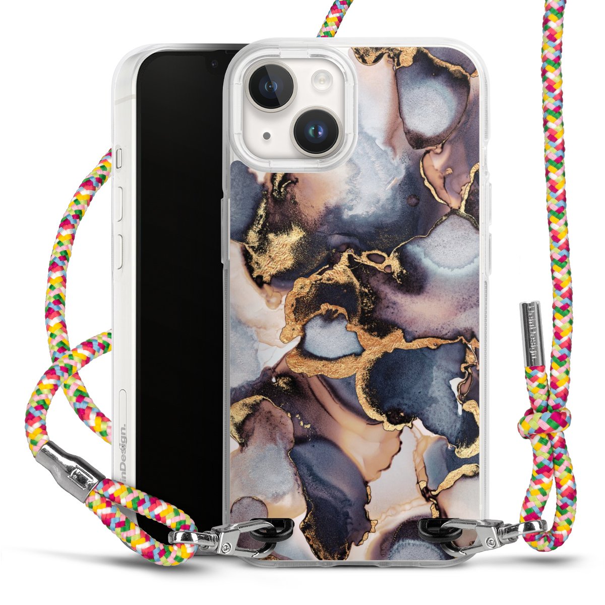 The flexible case is made from a highquality TPU material (thermoplastic Polyurethan). Thanks to its longlasting and break resistant characterisitcs, the case is flexible yet consistent in form and has a great grip and feel. The textile strap made from Polyester gives a chic yet casual accent allowing you to carry your phone like a bag or necklace - a practical gadget perfect for your next adventure. The textile strap is about 1.70 meters long and the length can easily be adjusted through the knots. Our Carry Case is available in Colourful, Mint-Camouflage, Very-Berry, Sahara-Sand and Sparkling-Neon. The ends of the textile strap are covered with metallic end caps to protect them against fraying.