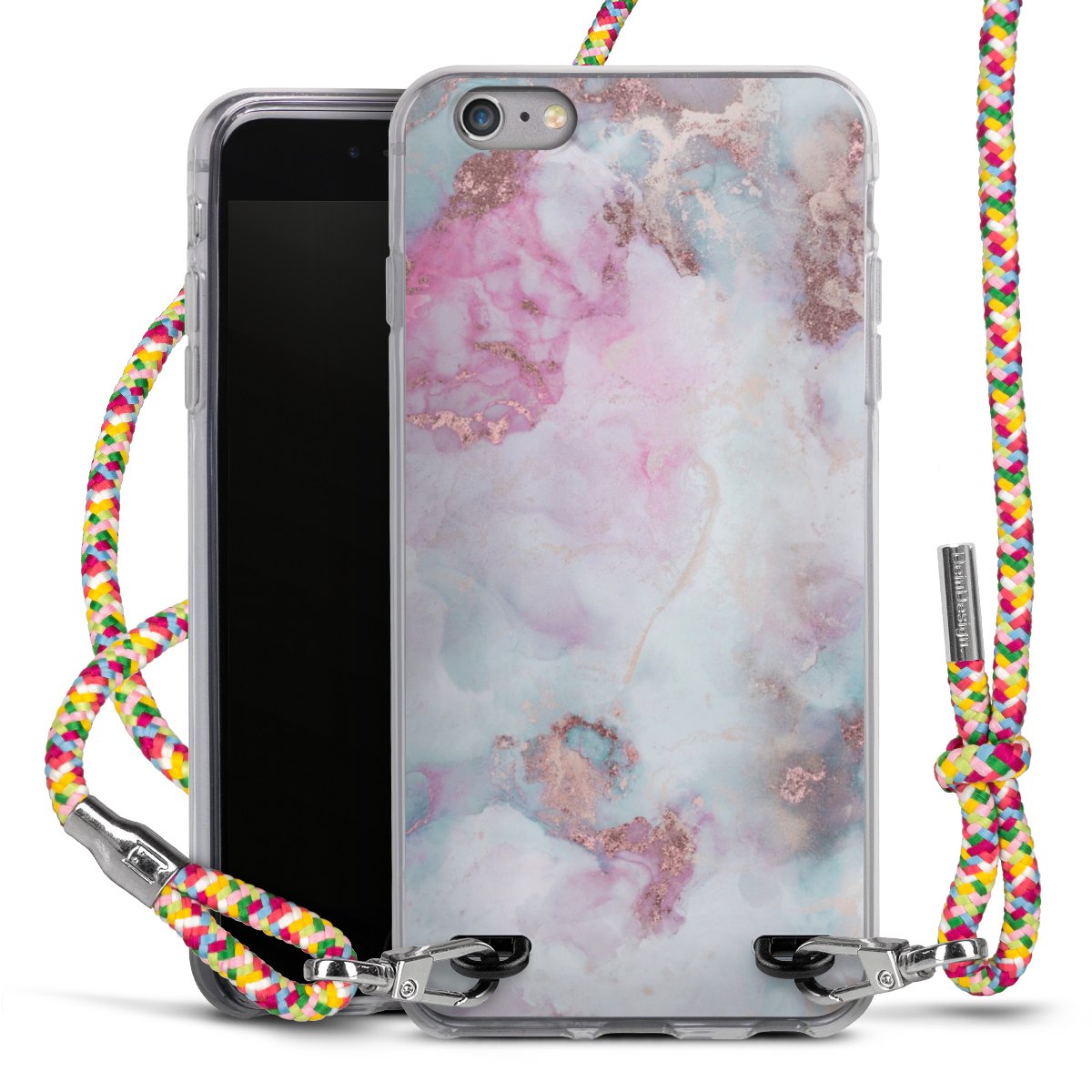 The flexible case is made from a highquality TPU material (thermoplastic Polyurethan). Thanks to its longlasting and break resistant characterisitcs, the case is flexible yet consistent in form and has a great grip and feel. The textile strap made from Polyester gives a chic yet casual accent allowing you to carry your phone like a bag or necklace - a practical gadget perfect for your next adventure. The textile strap is about 1.70 meters long and the length can easily be adjusted through the knots. Our Carry Case is available in Colourful, Mint-Camouflage, Very-Berry, Sahara-Sand and Sparkling-Neon. The ends of the textile strap are covered with metallic end caps to protect them against fraying.