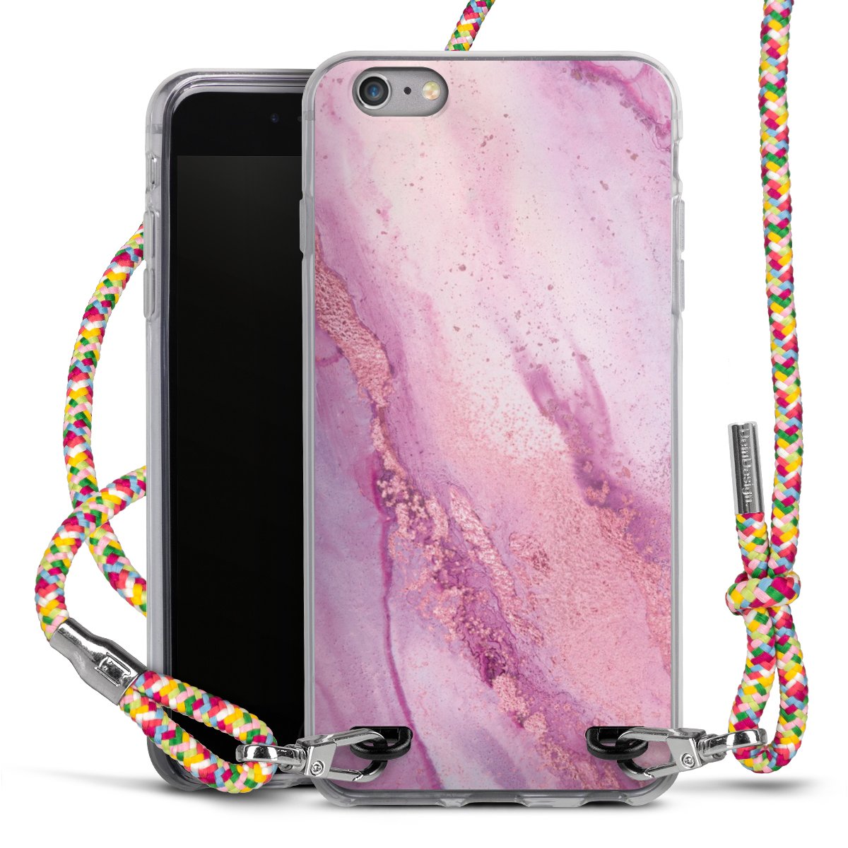 The flexible case is made from a highquality TPU material (thermoplastic Polyurethan). Thanks to its longlasting and break resistant characterisitcs, the case is flexible yet consistent in form and has a great grip and feel. The textile strap made from Polyester gives a chic yet casual accent allowing you to carry your phone like a bag or necklace - a practical gadget perfect for your next adventure. The textile strap is about 1.70 meters long and the length can easily be adjusted through the knots. Our Carry Case is available in Colourful, Mint-Camouflage, Very-Berry, Sahara-Sand and Sparkling-Neon. The ends of the textile strap are covered with metallic end caps to protect them against fraying.