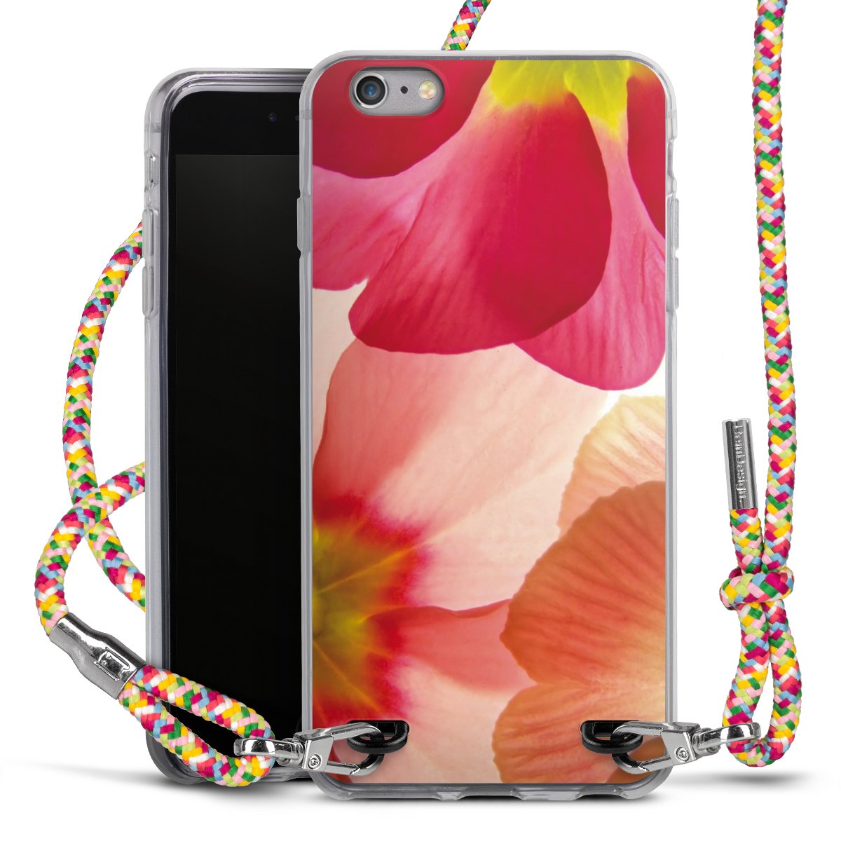 The flexible case is made from a highquality TPU material (thermoplastic Polyurethan). Thanks to its longlasting and break resistant characterisitcs, the case is flexible yet consistent in form and has a great grip and feel. The textile strap made from Polyester gives a chic yet casual accent allowing you to carry your phone like a bag or necklace - a practical gadget perfect for your next adventure. The textile strap is about 1.70 meters long and the length can easily be adjusted through the knots. Our Carry Case is available in Colourful, Mint-Camouflage, Very-Berry, Sahara-Sand and Sparkling-Neon. The ends of the textile strap are covered with metallic end caps to protect them against fraying.