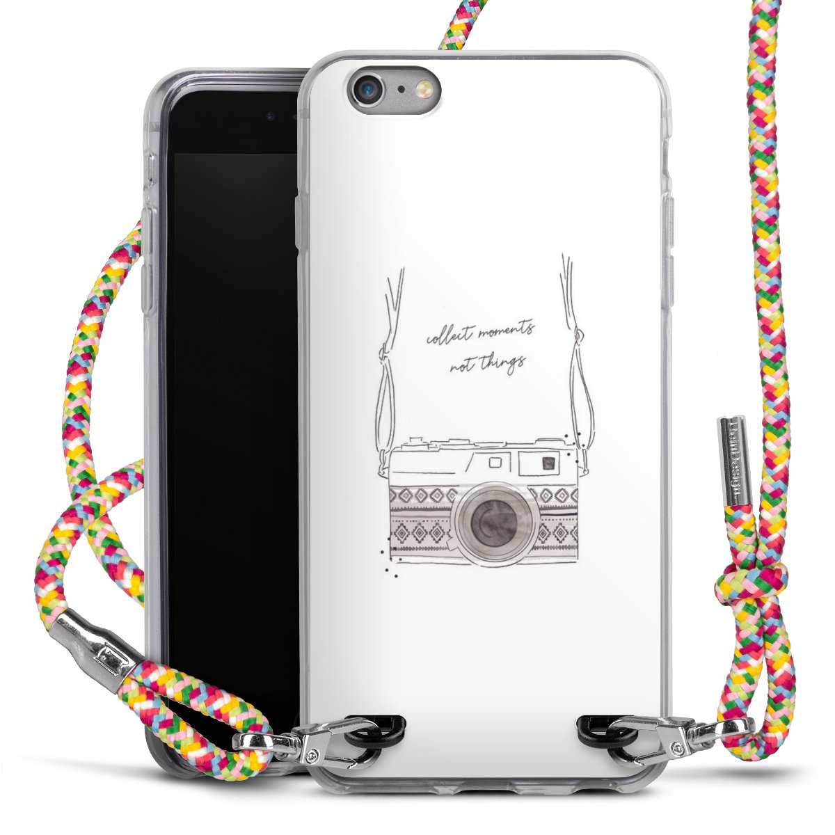 The flexible case is made from a highquality TPU material (thermoplastic Polyurethan). Thanks to its longlasting and break resistant characterisitcs, the case is flexible yet consistent in form and has a great grip and feel. The textile strap made from Polyester gives a chic yet casual accent allowing you to carry your phone like a bag or necklace - a practical gadget perfect for your next adventure. The textile strap is about 1.70 meters long and the length can easily be adjusted through the knots. Our Carry Case is available in Colourful, Mint-Camouflage, Very-Berry, Sahara-Sand and Sparkling-Neon. The ends of the textile strap are covered with metallic end caps to protect them against fraying.