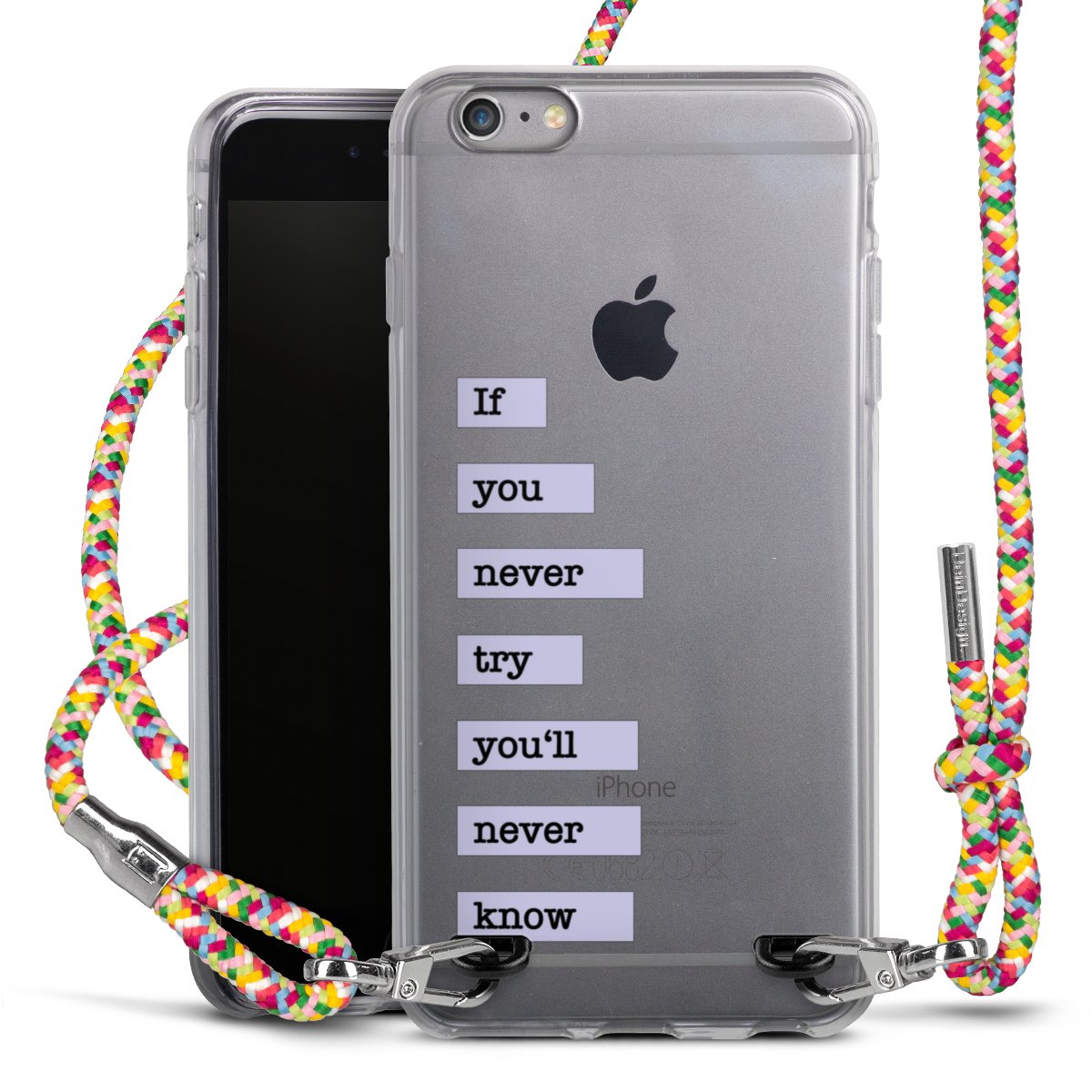 The flexible case is made from a highquality TPU material (thermoplastic Polyurethan). Thanks to its longlasting and break resistant characterisitcs, the case is flexible yet consistent in form and has a great grip and feel. The textile strap made from Polyester gives a chic yet casual accent allowing you to carry your phone like a bag or necklace - a practical gadget perfect for your next adventure. The textile strap is about 1.70 meters long and the length can easily be adjusted through the knots. Our Carry Case is available in Colourful, Mint-Camouflage, Very-Berry, Sahara-Sand and Sparkling-Neon. The ends of the textile strap are covered with metallic end caps to protect them against fraying.