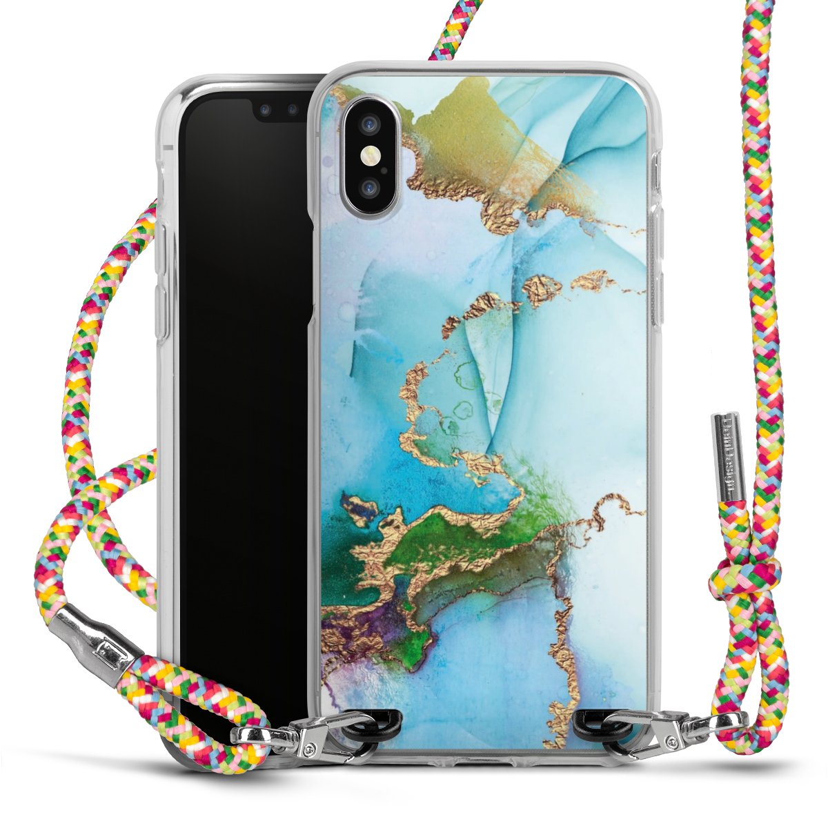The flexible case is made from a highquality TPU material (thermoplastic Polyurethan). Thanks to its longlasting and break resistant characterisitcs, the case is flexible yet consistent in form and has a great grip and feel. The textile strap made from Polyester gives a chic yet casual accent allowing you to carry your phone like a bag or necklace - a practical gadget perfect for your next adventure. The textile strap is about 1.70 meters long and the length can easily be adjusted through the knots. Our Carry Case is available in Colourful, Mint-Camouflage, Very-Berry, Sahara-Sand and Sparkling-Neon. The ends of the textile strap are covered with metallic end caps to protect them against fraying.
