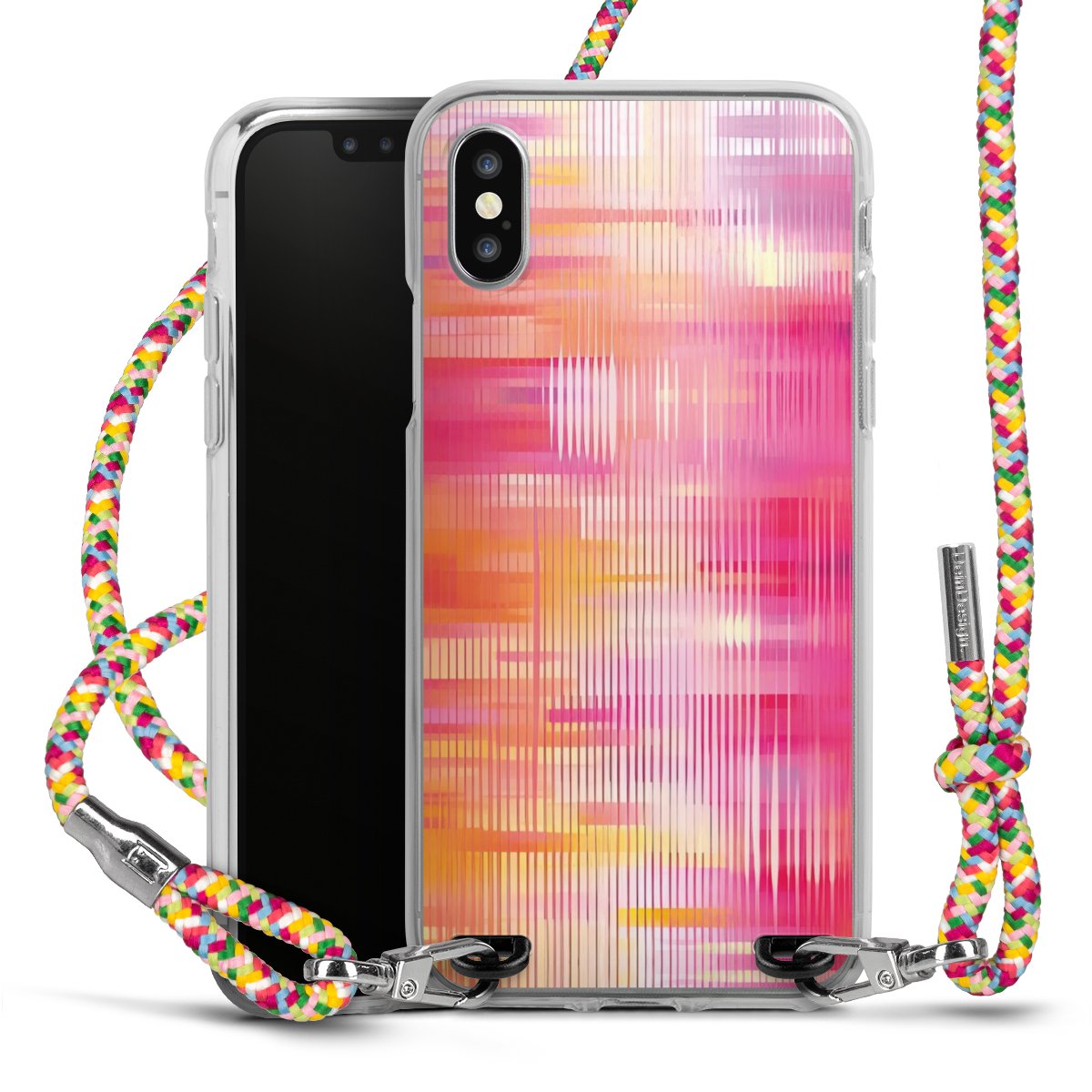 The flexible case is made from a highquality TPU material (thermoplastic Polyurethan). Thanks to its longlasting and break resistant characterisitcs, the case is flexible yet consistent in form and has a great grip and feel. The textile strap made from Polyester gives a chic yet casual accent allowing you to carry your phone like a bag or necklace - a practical gadget perfect for your next adventure. The textile strap is about 1.70 meters long and the length can easily be adjusted through the knots. Our Carry Case is available in Colourful, Mint-Camouflage, Very-Berry, Sahara-Sand and Sparkling-Neon. The ends of the textile strap are covered with metallic end caps to protect them against fraying.
