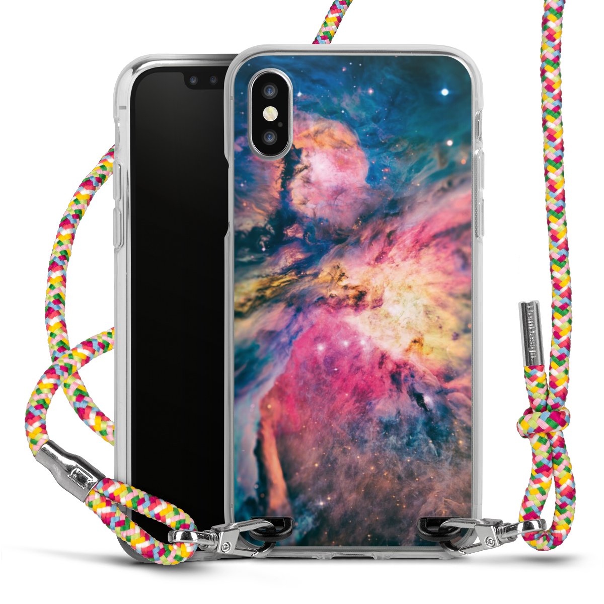 The flexible case is made from a highquality TPU material (thermoplastic Polyurethan). Thanks to its longlasting and break resistant characterisitcs, the case is flexible yet consistent in form and has a great grip and feel. The textile strap made from Polyester gives a chic yet casual accent allowing you to carry your phone like a bag or necklace - a practical gadget perfect for your next adventure. The textile strap is about 1.70 meters long and the length can easily be adjusted through the knots. Our Carry Case is available in Colourful, Mint-Camouflage, Very-Berry, Sahara-Sand and Sparkling-Neon. The ends of the textile strap are covered with metallic end caps to protect them against fraying.
