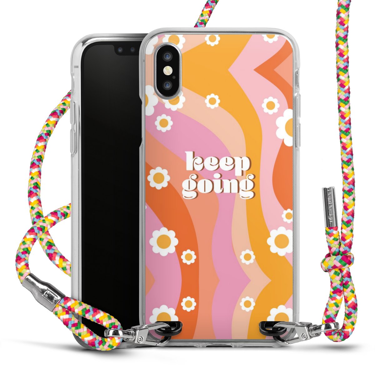 The flexible case is made from a highquality TPU material (thermoplastic Polyurethan). Thanks to its longlasting and break resistant characterisitcs, the case is flexible yet consistent in form and has a great grip and feel. The textile strap made from Polyester gives a chic yet casual accent allowing you to carry your phone like a bag or necklace - a practical gadget perfect for your next adventure. The textile strap is about 1.70 meters long and the length can easily be adjusted through the knots. Our Carry Case is available in Colourful, Mint-Camouflage, Very-Berry, Sahara-Sand and Sparkling-Neon. The ends of the textile strap are covered with metallic end caps to protect them against fraying.