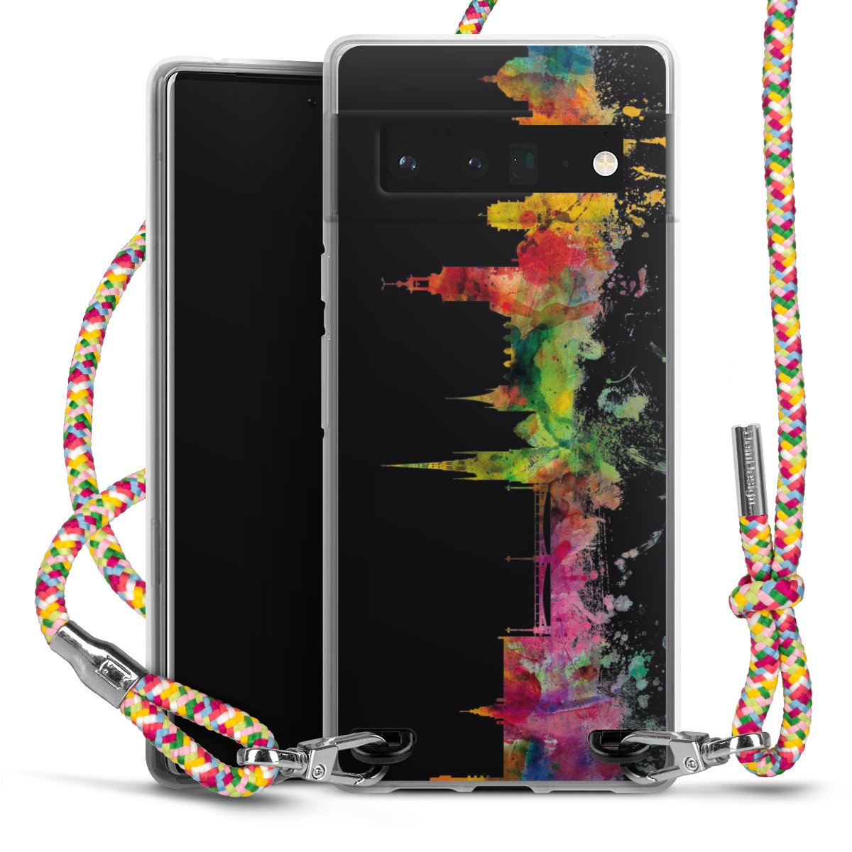 The flexible case is made from a highquality TPU material (thermoplastic Polyurethan). Thanks to its longlasting and break resistant characterisitcs, the case is flexible yet consistent in form and has a great grip and feel. The textile strap made from Polyester gives a chic yet casual accent allowing you to carry your phone like a bag or necklace - a practical gadget perfect for your next adventure. The textile strap is about 1.70 meters long and the length can easily be adjusted through the knots. Our Carry Case is available in Colourful, Mint-Camouflage, Very-Berry, Sahara-Sand and Sparkling-Neon. The ends of the textile strap are covered with metallic end caps to protect them against fraying.