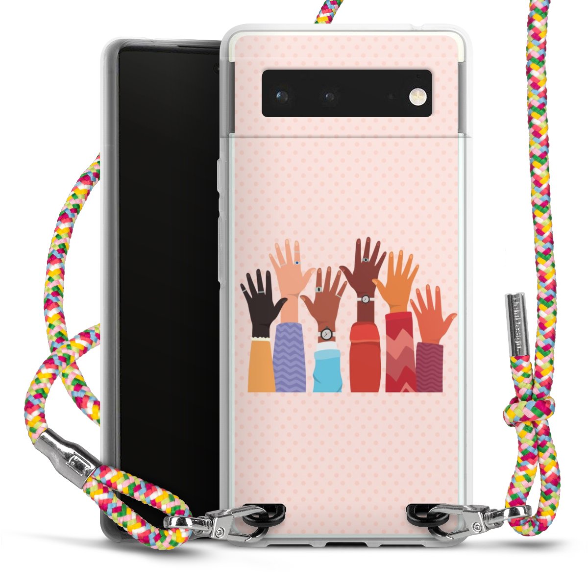 The flexible case is made from a highquality TPU material (thermoplastic Polyurethan). Thanks to its longlasting and break resistant characterisitcs, the case is flexible yet consistent in form and has a great grip and feel. The textile strap made from Polyester gives a chic yet casual accent allowing you to carry your phone like a bag or necklace - a practical gadget perfect for your next adventure. The textile strap is about 1.70 meters long and the length can easily be adjusted through the knots. Our Carry Case is available in Colourful, Mint-Camouflage, Very-Berry, Sahara-Sand and Sparkling-Neon. The ends of the textile strap are covered with metallic end caps to protect them against fraying.