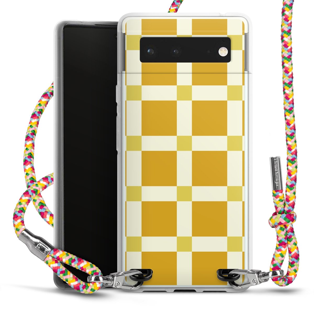 The flexible case is made from a highquality TPU material (thermoplastic Polyurethan). Thanks to its longlasting and break resistant characterisitcs, the case is flexible yet consistent in form and has a great grip and feel. The textile strap made from Polyester gives a chic yet casual accent allowing you to carry your phone like a bag or necklace - a practical gadget perfect for your next adventure. The textile strap is about 1.70 meters long and the length can easily be adjusted through the knots. Our Carry Case is available in Colourful, Mint-Camouflage, Very-Berry, Sahara-Sand and Sparkling-Neon. The ends of the textile strap are covered with metallic end caps to protect them against fraying.