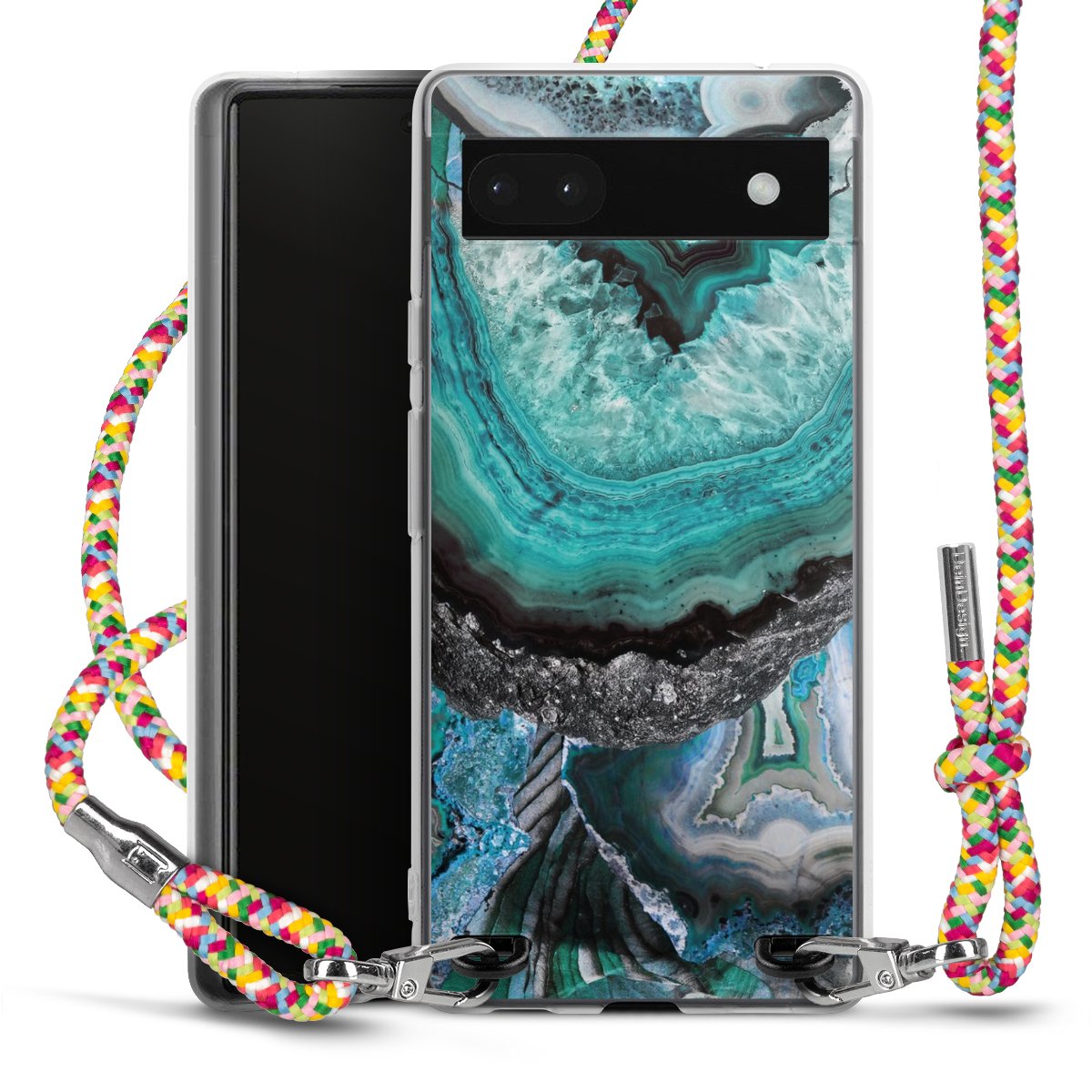 The flexible case is made from a highquality TPU material (thermoplastic Polyurethan). Thanks to its longlasting and break resistant characterisitcs, the case is flexible yet consistent in form and has a great grip and feel. The textile strap made from Polyester gives a chic yet casual accent allowing you to carry your phone like a bag or necklace - a practical gadget perfect for your next adventure. The textile strap is about 1.70 meters long and the length can easily be adjusted through the knots. Our Carry Case is available in Colourful, Mint-Camouflage, Very-Berry, Sahara-Sand and Sparkling-Neon. The ends of the textile strap are covered with metallic end caps to protect them against fraying.