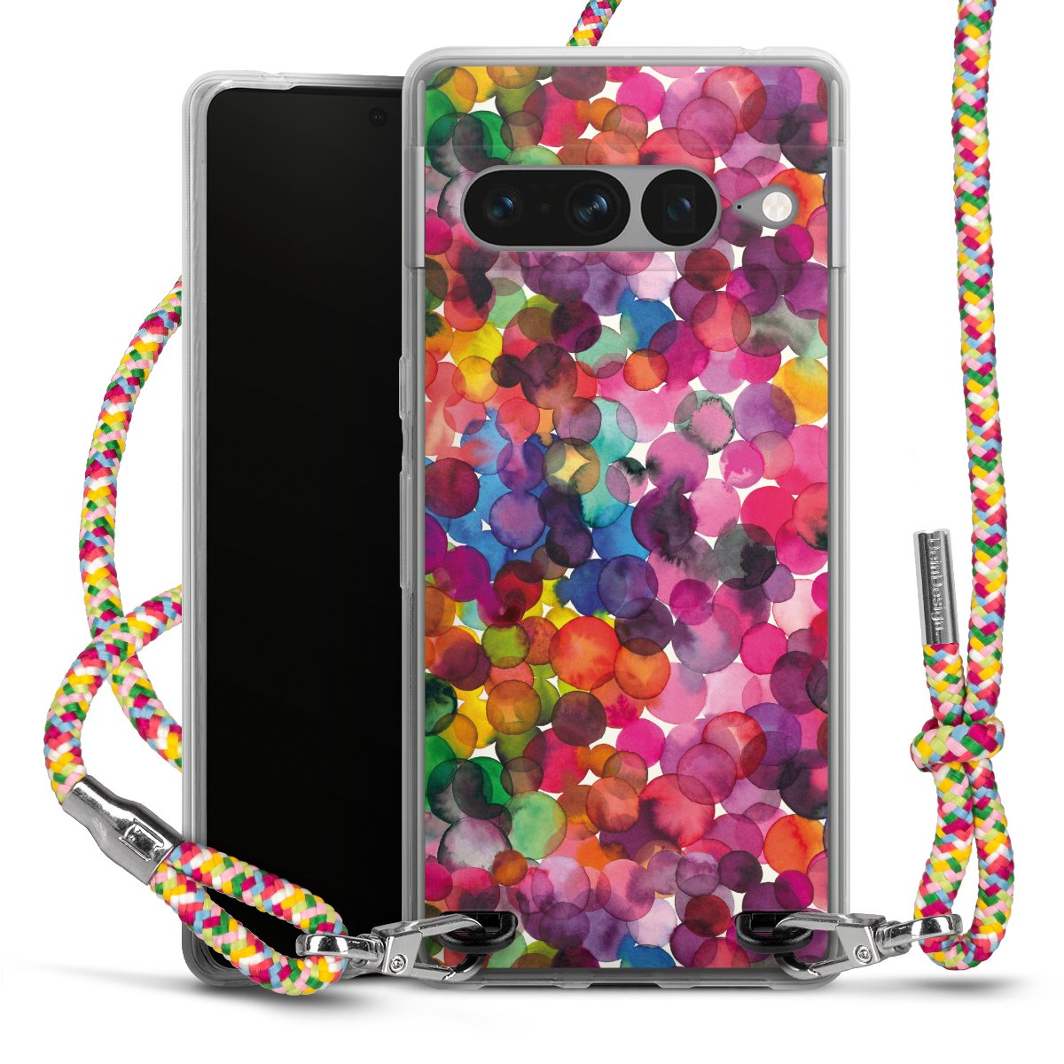 The flexible case is made from a highquality TPU material (thermoplastic Polyurethan). Thanks to its longlasting and break resistant characterisitcs, the case is flexible yet consistent in form and has a great grip and feel. The textile strap made from Polyester gives a chic yet casual accent allowing you to carry your phone like a bag or necklace - a practical gadget perfect for your next adventure. The textile strap is about 1.70 meters long and the length can easily be adjusted through the knots. Our Carry Case is available in Colourful, Mint-Camouflage, Very-Berry, Sahara-Sand and Sparkling-Neon. The ends of the textile strap are covered with metallic end caps to protect them against fraying.