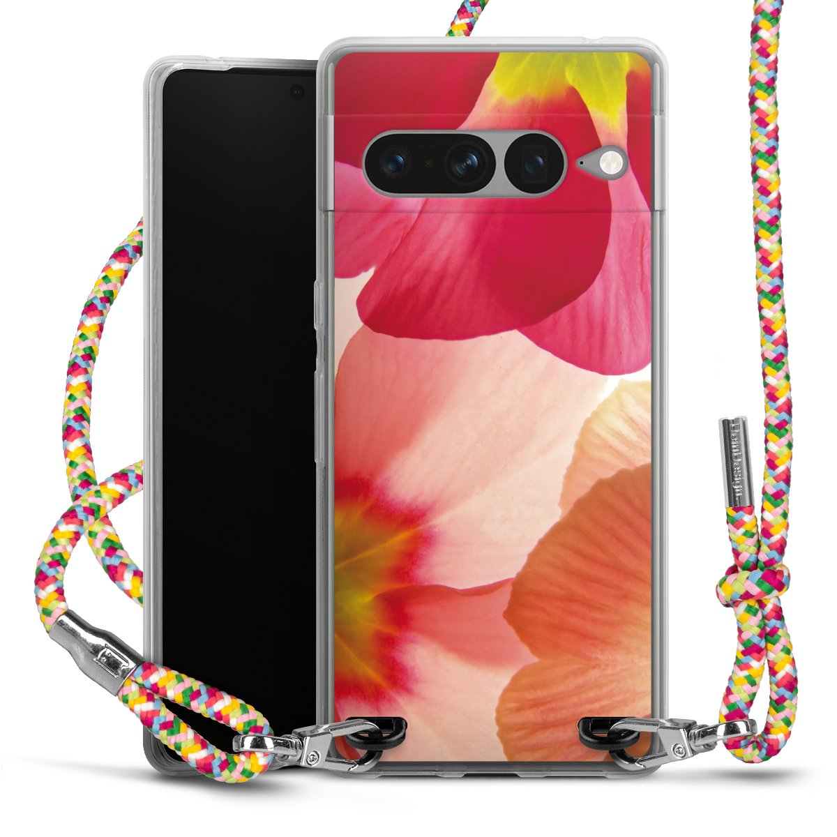 The flexible case is made from a highquality TPU material (thermoplastic Polyurethan). Thanks to its longlasting and break resistant characterisitcs, the case is flexible yet consistent in form and has a great grip and feel. The textile strap made from Polyester gives a chic yet casual accent allowing you to carry your phone like a bag or necklace - a practical gadget perfect for your next adventure. The textile strap is about 1.70 meters long and the length can easily be adjusted through the knots. Our Carry Case is available in Colourful, Mint-Camouflage, Very-Berry, Sahara-Sand and Sparkling-Neon. The ends of the textile strap are covered with metallic end caps to protect them against fraying.