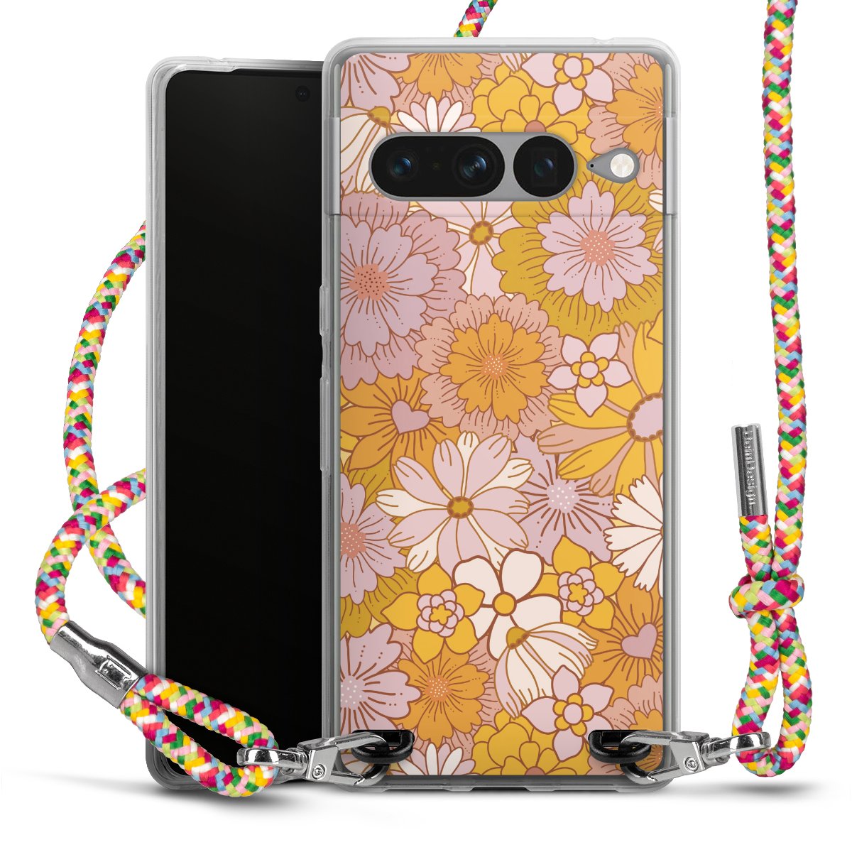 The flexible case is made from a highquality TPU material (thermoplastic Polyurethan). Thanks to its longlasting and break resistant characterisitcs, the case is flexible yet consistent in form and has a great grip and feel. The textile strap made from Polyester gives a chic yet casual accent allowing you to carry your phone like a bag or necklace - a practical gadget perfect for your next adventure. The textile strap is about 1.70 meters long and the length can easily be adjusted through the knots. Our Carry Case is available in Colourful, Mint-Camouflage, Very-Berry, Sahara-Sand and Sparkling-Neon. The ends of the textile strap are covered with metallic end caps to protect them against fraying.
