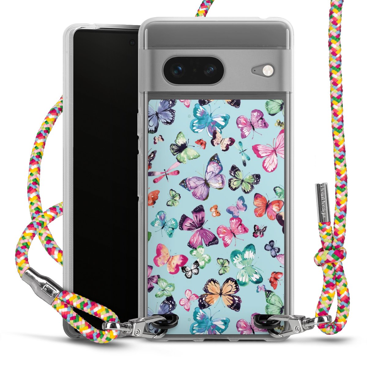 The flexible case is made from a highquality TPU material (thermoplastic Polyurethan). Thanks to its longlasting and break resistant characterisitcs, the case is flexible yet consistent in form and has a great grip and feel. The textile strap made from Polyester gives a chic yet casual accent allowing you to carry your phone like a bag or necklace - a practical gadget perfect for your next adventure. The textile strap is about 1.70 meters long and the length can easily be adjusted through the knots. Our Carry Case is available in Colourful, Mint-Camouflage, Very-Berry, Sahara-Sand and Sparkling-Neon. The ends of the textile strap are covered with metallic end caps to protect them against fraying.