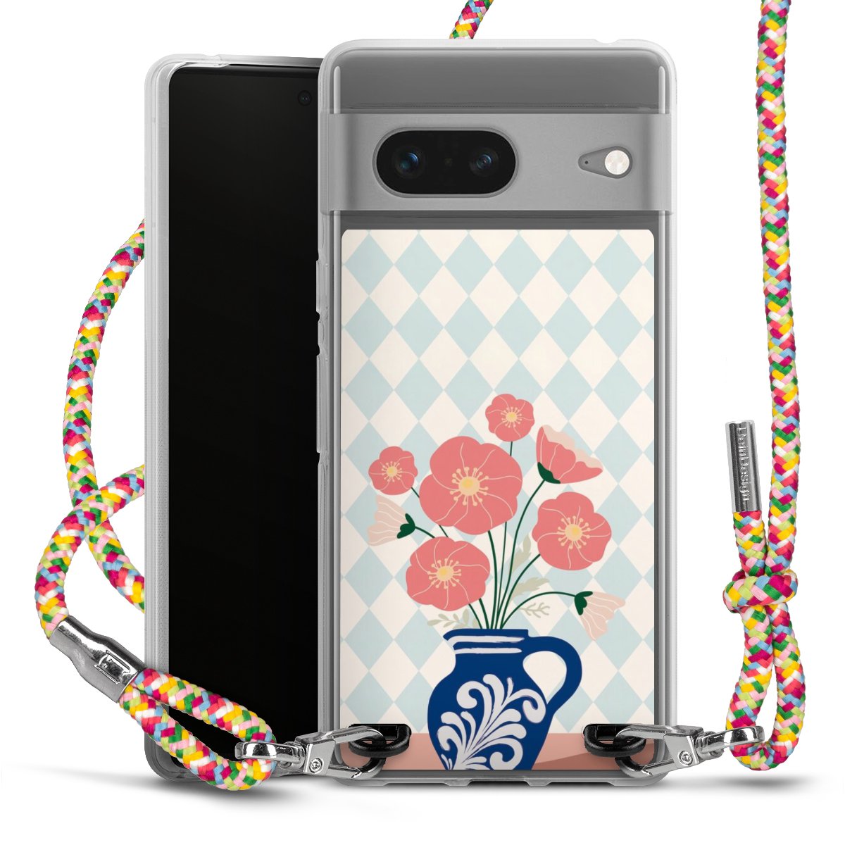 The flexible case is made from a highquality TPU material (thermoplastic Polyurethan). Thanks to its longlasting and break resistant characterisitcs, the case is flexible yet consistent in form and has a great grip and feel. The textile strap made from Polyester gives a chic yet casual accent allowing you to carry your phone like a bag or necklace - a practical gadget perfect for your next adventure. The textile strap is about 1.70 meters long and the length can easily be adjusted through the knots. Our Carry Case is available in Colourful, Mint-Camouflage, Very-Berry, Sahara-Sand and Sparkling-Neon. The ends of the textile strap are covered with metallic end caps to protect them against fraying.