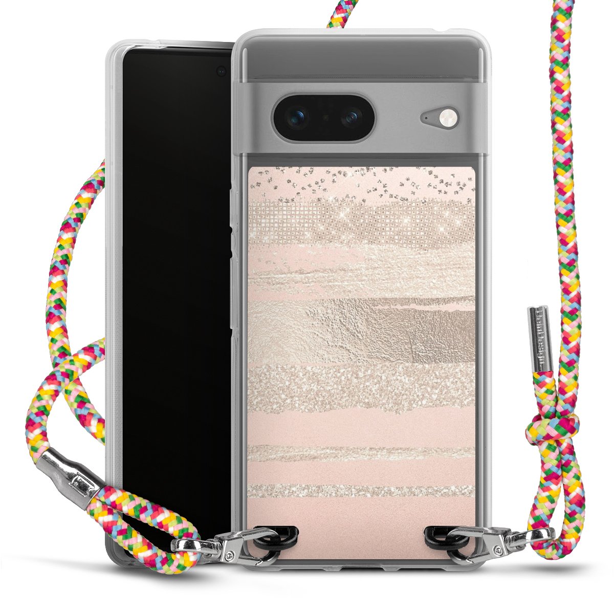 The flexible case is made from a highquality TPU material (thermoplastic Polyurethan). Thanks to its longlasting and break resistant characterisitcs, the case is flexible yet consistent in form and has a great grip and feel. The textile strap made from Polyester gives a chic yet casual accent allowing you to carry your phone like a bag or necklace - a practical gadget perfect for your next adventure. The textile strap is about 1.70 meters long and the length can easily be adjusted through the knots. Our Carry Case is available in Colourful, Mint-Camouflage, Very-Berry, Sahara-Sand and Sparkling-Neon. The ends of the textile strap are covered with metallic end caps to protect them against fraying.