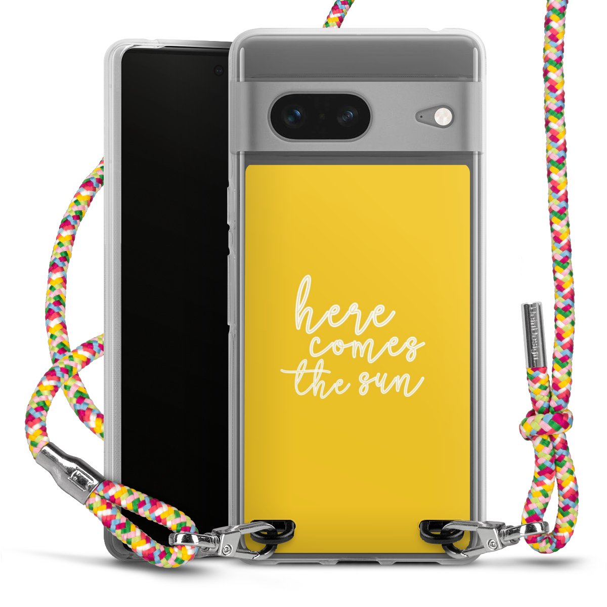 The flexible case is made from a highquality TPU material (thermoplastic Polyurethan). Thanks to its longlasting and break resistant characterisitcs, the case is flexible yet consistent in form and has a great grip and feel. The textile strap made from Polyester gives a chic yet casual accent allowing you to carry your phone like a bag or necklace - a practical gadget perfect for your next adventure. The textile strap is about 1.70 meters long and the length can easily be adjusted through the knots. Our Carry Case is available in Colourful, Mint-Camouflage, Very-Berry, Sahara-Sand and Sparkling-Neon. The ends of the textile strap are covered with metallic end caps to protect them against fraying.