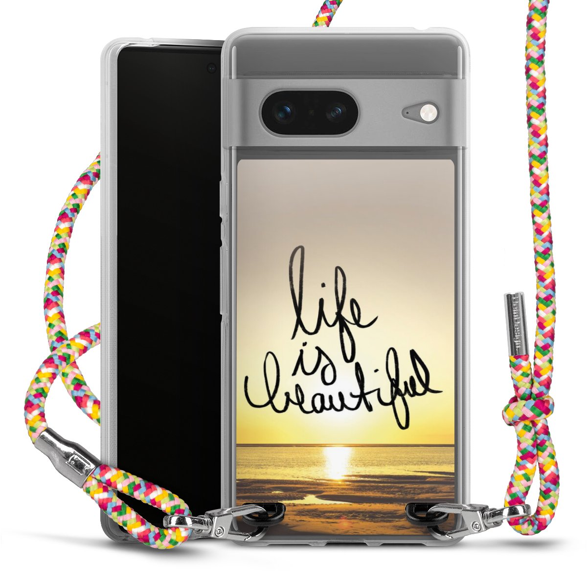 The flexible case is made from a highquality TPU material (thermoplastic Polyurethan). Thanks to its longlasting and break resistant characterisitcs, the case is flexible yet consistent in form and has a great grip and feel. The textile strap made from Polyester gives a chic yet casual accent allowing you to carry your phone like a bag or necklace - a practical gadget perfect for your next adventure. The textile strap is about 1.70 meters long and the length can easily be adjusted through the knots. Our Carry Case is available in Colourful, Mint-Camouflage, Very-Berry, Sahara-Sand and Sparkling-Neon. The ends of the textile strap are covered with metallic end caps to protect them against fraying.