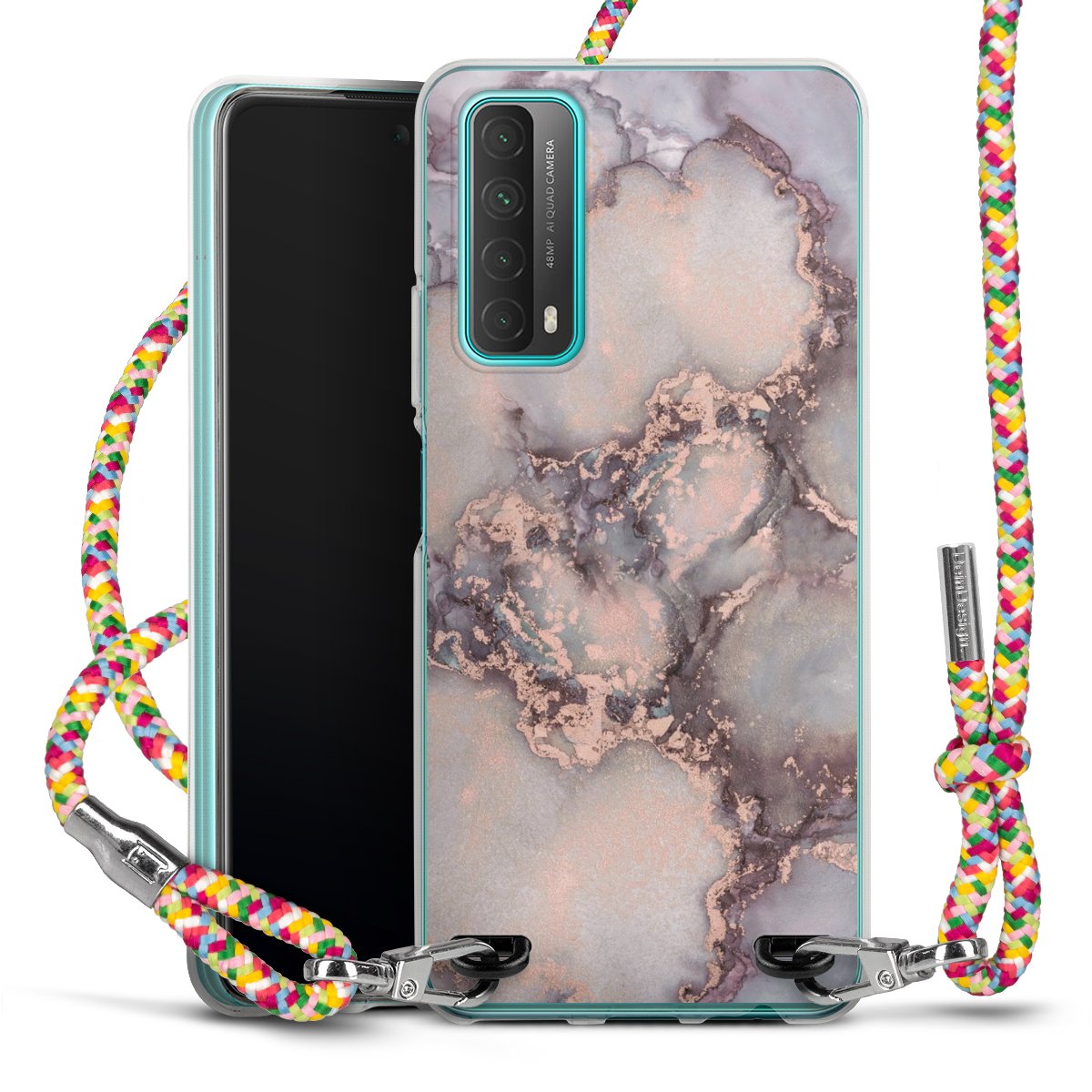 The flexible case is made from a highquality TPU material (thermoplastic Polyurethan). Thanks to its longlasting and break resistant characterisitcs, the case is flexible yet consistent in form and has a great grip and feel. The textile strap made from Polyester gives a chic yet casual accent allowing you to carry your phone like a bag or necklace - a practical gadget perfect for your next adventure. The textile strap is about 1.70 meters long and the length can easily be adjusted through the knots. Our Carry Case is available in Colourful, Mint-Camouflage, Very-Berry, Sahara-Sand and Sparkling-Neon. The ends of the textile strap are covered with metallic end caps to protect them against fraying.