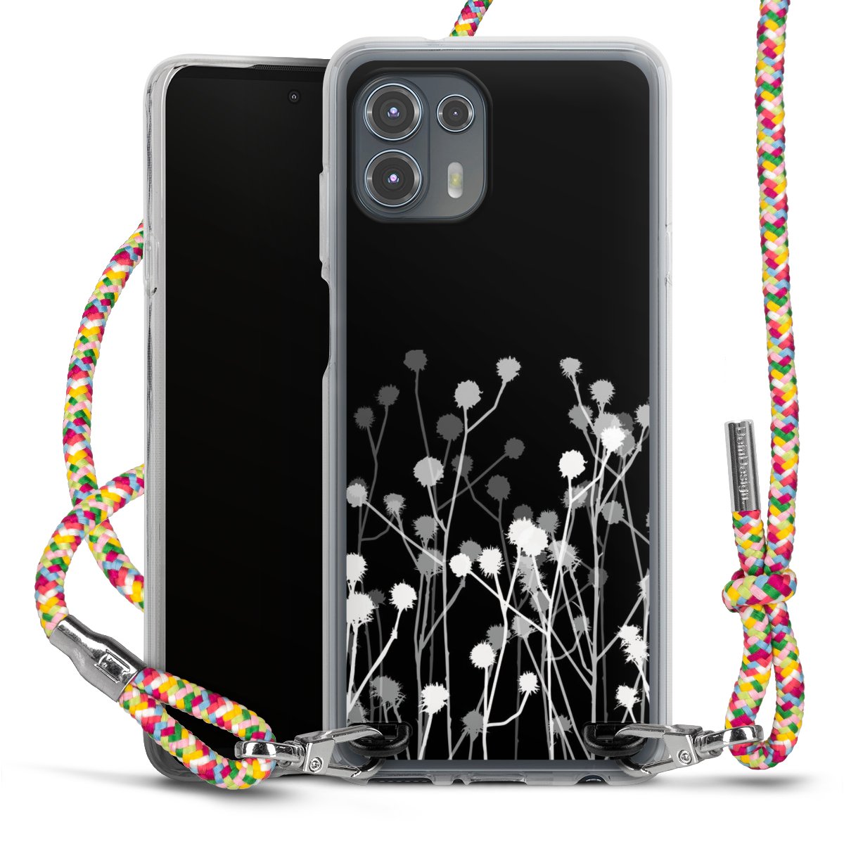 The flexible case is made from a highquality TPU material (thermoplastic Polyurethan). Thanks to its longlasting and break resistant characterisitcs, the case is flexible yet consistent in form and has a great grip and feel. The textile strap made from Polyester gives a chic yet casual accent allowing you to carry your phone like a bag or necklace - a practical gadget perfect for your next adventure. The textile strap is about 1.70 meters long and the length can easily be adjusted through the knots. Our Carry Case is available in Colourful, Mint-Camouflage, Very-Berry, Sahara-Sand and Sparkling-Neon. The ends of the textile strap are covered with metallic end caps to protect them against fraying.