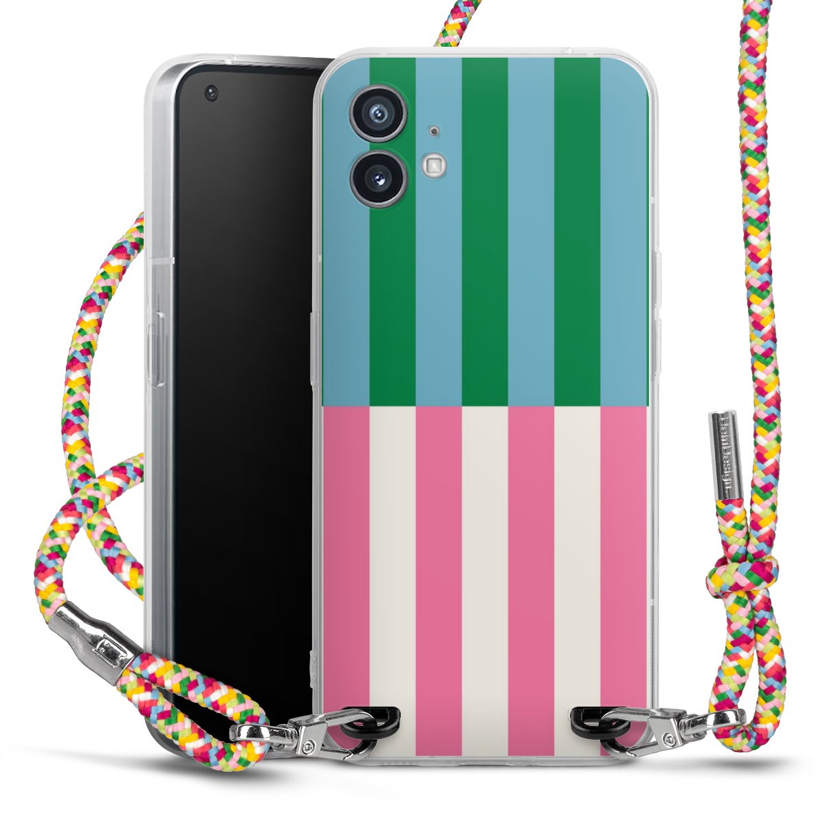 The flexible case is made from a highquality TPU material (thermoplastic Polyurethan). Thanks to its longlasting and break resistant characterisitcs, the case is flexible yet consistent in form and has a great grip and feel. The textile strap made from Polyester gives a chic yet casual accent allowing you to carry your phone like a bag or necklace - a practical gadget perfect for your next adventure. The textile strap is about 1.70 meters long and the length can easily be adjusted through the knots. Our Carry Case is available in Colourful, Mint-Camouflage, Very-Berry, Sahara-Sand and Sparkling-Neon. The ends of the textile strap are covered with metallic end caps to protect them against fraying.