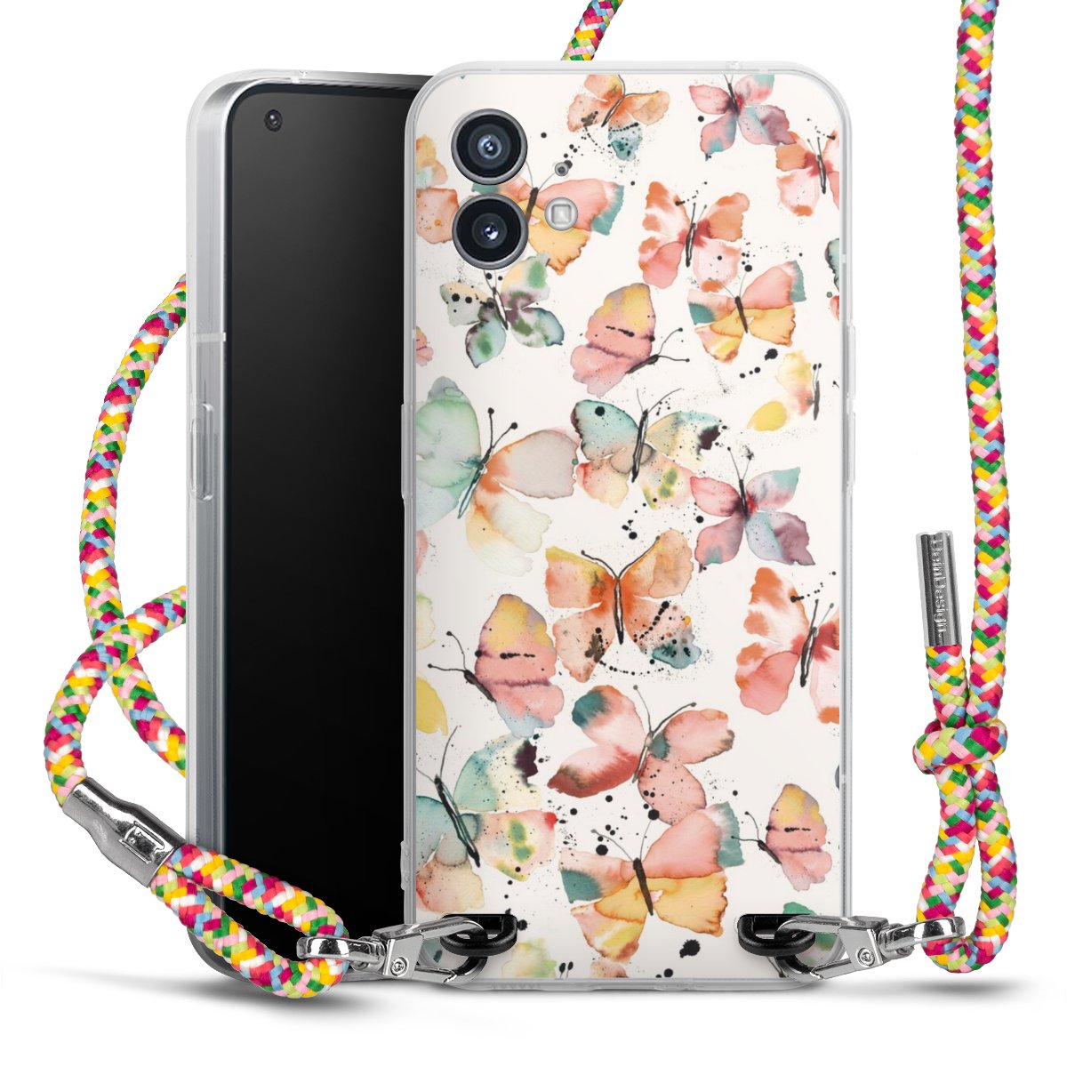 The flexible case is made from a highquality TPU material (thermoplastic Polyurethan). Thanks to its longlasting and break resistant characterisitcs, the case is flexible yet consistent in form and has a great grip and feel. The textile strap made from Polyester gives a chic yet casual accent allowing you to carry your phone like a bag or necklace - a practical gadget perfect for your next adventure. The textile strap is about 1.70 meters long and the length can easily be adjusted through the knots. Our Carry Case is available in Colourful, Mint-Camouflage, Very-Berry, Sahara-Sand and Sparkling-Neon. The ends of the textile strap are covered with metallic end caps to protect them against fraying.