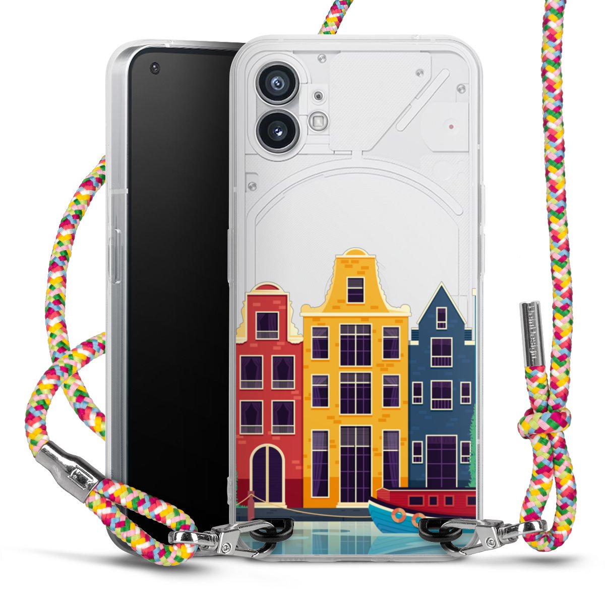 The flexible case is made from a highquality TPU material (thermoplastic Polyurethan). Thanks to its longlasting and break resistant characterisitcs, the case is flexible yet consistent in form and has a great grip and feel. The textile strap made from Polyester gives a chic yet casual accent allowing you to carry your phone like a bag or necklace - a practical gadget perfect for your next adventure. The textile strap is about 1.70 meters long and the length can easily be adjusted through the knots. Our Carry Case is available in Colourful, Mint-Camouflage, Very-Berry, Sahara-Sand and Sparkling-Neon. The ends of the textile strap are covered with metallic end caps to protect them against fraying.
