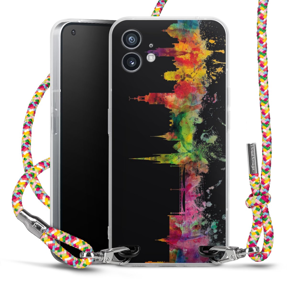 The flexible case is made from a highquality TPU material (thermoplastic Polyurethan). Thanks to its longlasting and break resistant characterisitcs, the case is flexible yet consistent in form and has a great grip and feel. The textile strap made from Polyester gives a chic yet casual accent allowing you to carry your phone like a bag or necklace - a practical gadget perfect for your next adventure. The textile strap is about 1.70 meters long and the length can easily be adjusted through the knots. Our Carry Case is available in Colourful, Mint-Camouflage, Very-Berry, Sahara-Sand and Sparkling-Neon. The ends of the textile strap are covered with metallic end caps to protect them against fraying.