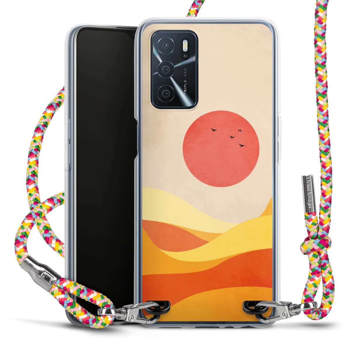 The flexible case is made from a highquality TPU material (thermoplastic Polyurethan). Thanks to its longlasting and break resistant characterisitcs, the case is flexible yet consistent in form and has a great grip and feel. The textile strap made from Polyester gives a chic yet casual accent allowing you to carry your phone like a bag or necklace - a practical gadget perfect for your next adventure. The textile strap is about 1.70 meters long and the length can easily be adjusted through the knots. Our Carry Case is available in Colourful, Mint-Camouflage, Very-Berry, Sahara-Sand and Sparkling-Neon. The ends of the textile strap are covered with metallic end caps to protect them against fraying.