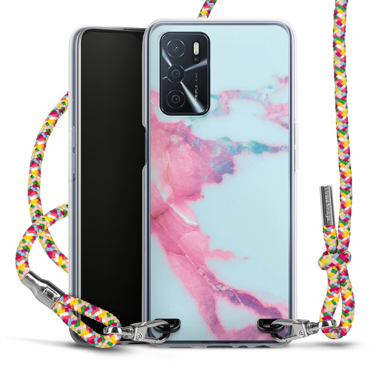 The flexible case is made from a highquality TPU material (thermoplastic Polyurethan). Thanks to its longlasting and break resistant characterisitcs, the case is flexible yet consistent in form and has a great grip and feel. The textile strap made from Polyester gives a chic yet casual accent allowing you to carry your phone like a bag or necklace - a practical gadget perfect for your next adventure. The textile strap is about 1.70 meters long and the length can easily be adjusted through the knots. Our Carry Case is available in Colourful, Mint-Camouflage, Very-Berry, Sahara-Sand and Sparkling-Neon. The ends of the textile strap are covered with metallic end caps to protect them against fraying.