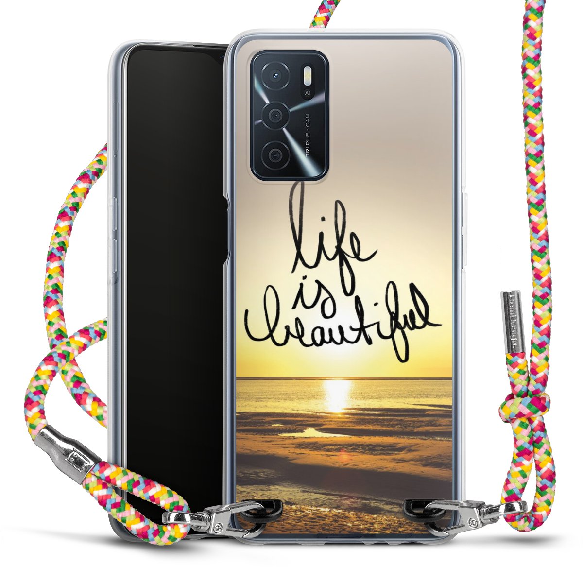 The flexible case is made from a highquality TPU material (thermoplastic Polyurethan). Thanks to its longlasting and break resistant characterisitcs, the case is flexible yet consistent in form and has a great grip and feel. The textile strap made from Polyester gives a chic yet casual accent allowing you to carry your phone like a bag or necklace - a practical gadget perfect for your next adventure. The textile strap is about 1.70 meters long and the length can easily be adjusted through the knots. Our Carry Case is available in Colourful, Mint-Camouflage, Very-Berry, Sahara-Sand and Sparkling-Neon. The ends of the textile strap are covered with metallic end caps to protect them against fraying.