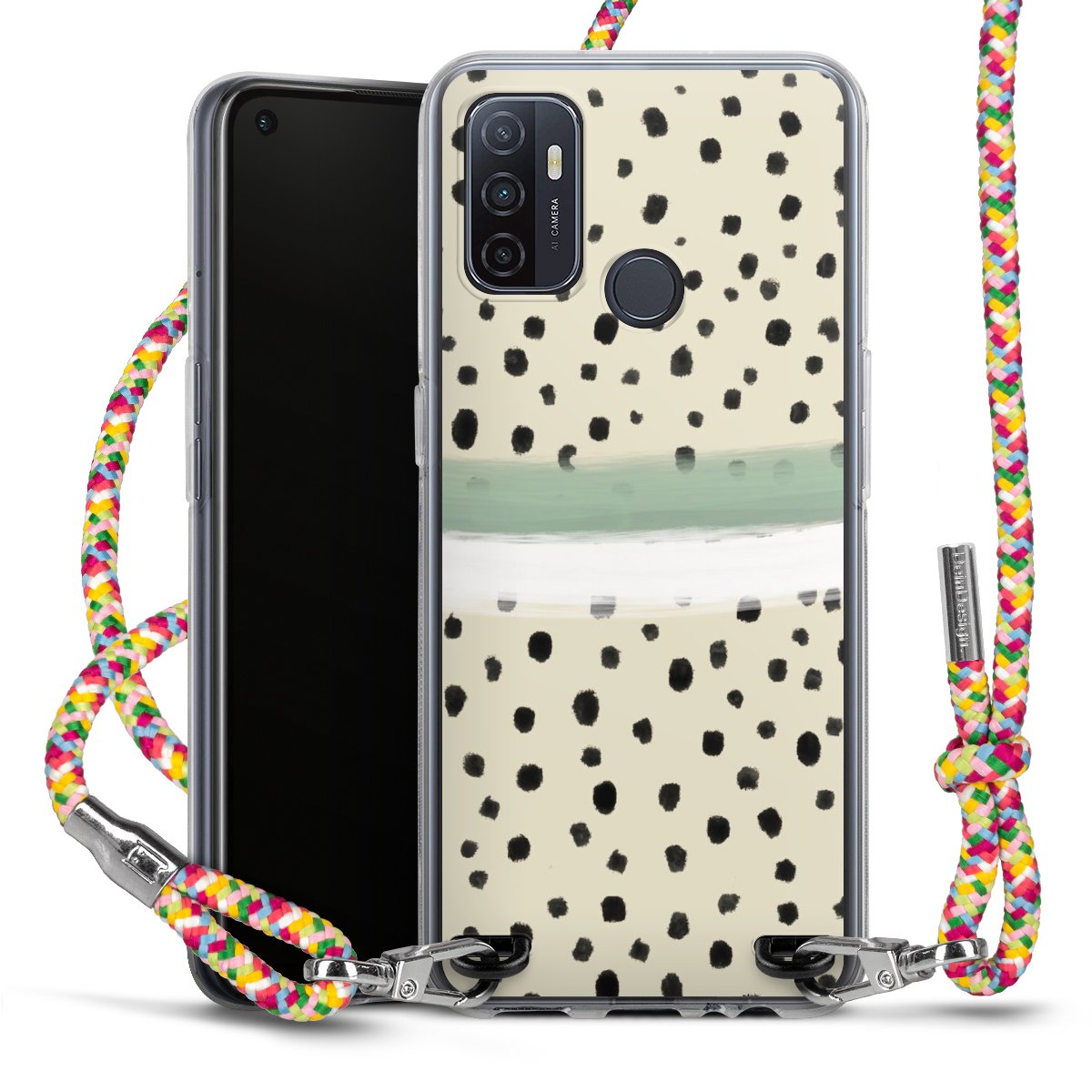 The flexible case is made from a highquality TPU material (thermoplastic Polyurethan). Thanks to its longlasting and break resistant characterisitcs, the case is flexible yet consistent in form and has a great grip and feel. The textile strap made from Polyester gives a chic yet casual accent allowing you to carry your phone like a bag or necklace - a practical gadget perfect for your next adventure. The textile strap is about 1.70 meters long and the length can easily be adjusted through the knots. Our Carry Case is available in Colourful, Mint-Camouflage, Very-Berry, Sahara-Sand and Sparkling-Neon. The ends of the textile strap are covered with metallic end caps to protect them against fraying.