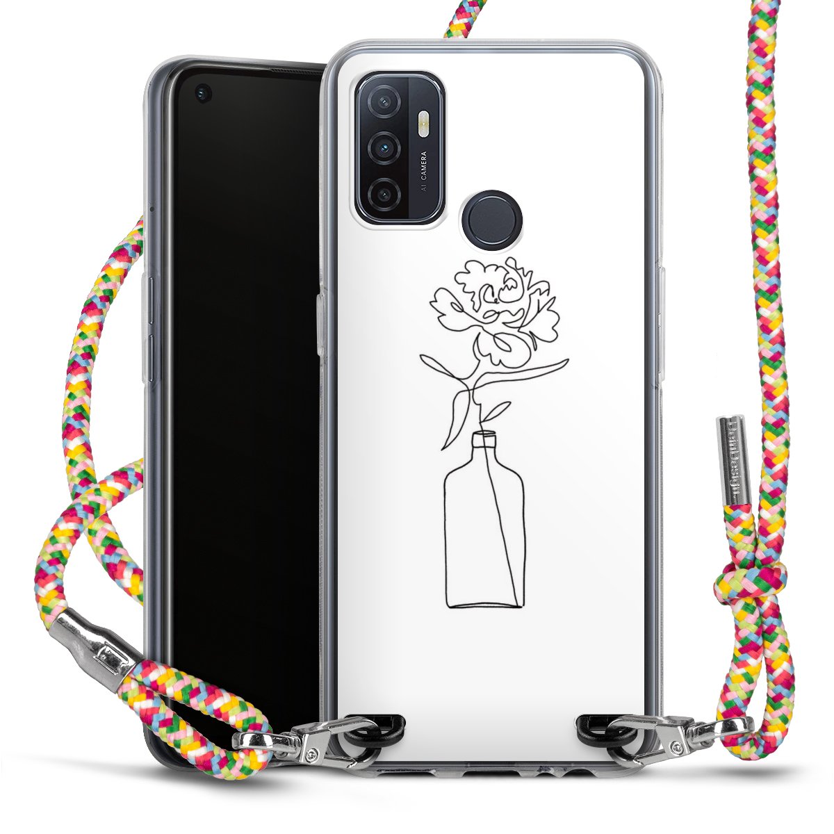 The flexible case is made from a highquality TPU material (thermoplastic Polyurethan). Thanks to its longlasting and break resistant characterisitcs, the case is flexible yet consistent in form and has a great grip and feel. The textile strap made from Polyester gives a chic yet casual accent allowing you to carry your phone like a bag or necklace - a practical gadget perfect for your next adventure. The textile strap is about 1.70 meters long and the length can easily be adjusted through the knots. Our Carry Case is available in Colourful, Mint-Camouflage, Very-Berry, Sahara-Sand and Sparkling-Neon. The ends of the textile strap are covered with metallic end caps to protect them against fraying.