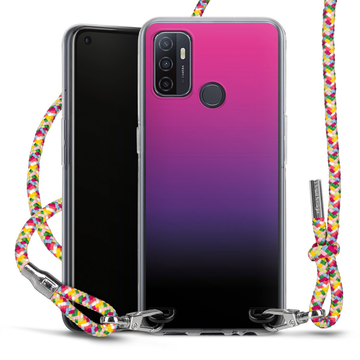 The flexible case is made from a highquality TPU material (thermoplastic Polyurethan). Thanks to its longlasting and break resistant characterisitcs, the case is flexible yet consistent in form and has a great grip and feel. The textile strap made from Polyester gives a chic yet casual accent allowing you to carry your phone like a bag or necklace - a practical gadget perfect for your next adventure. The textile strap is about 1.70 meters long and the length can easily be adjusted through the knots. Our Carry Case is available in Colourful, Mint-Camouflage, Very-Berry, Sahara-Sand and Sparkling-Neon. The ends of the textile strap are covered with metallic end caps to protect them against fraying.