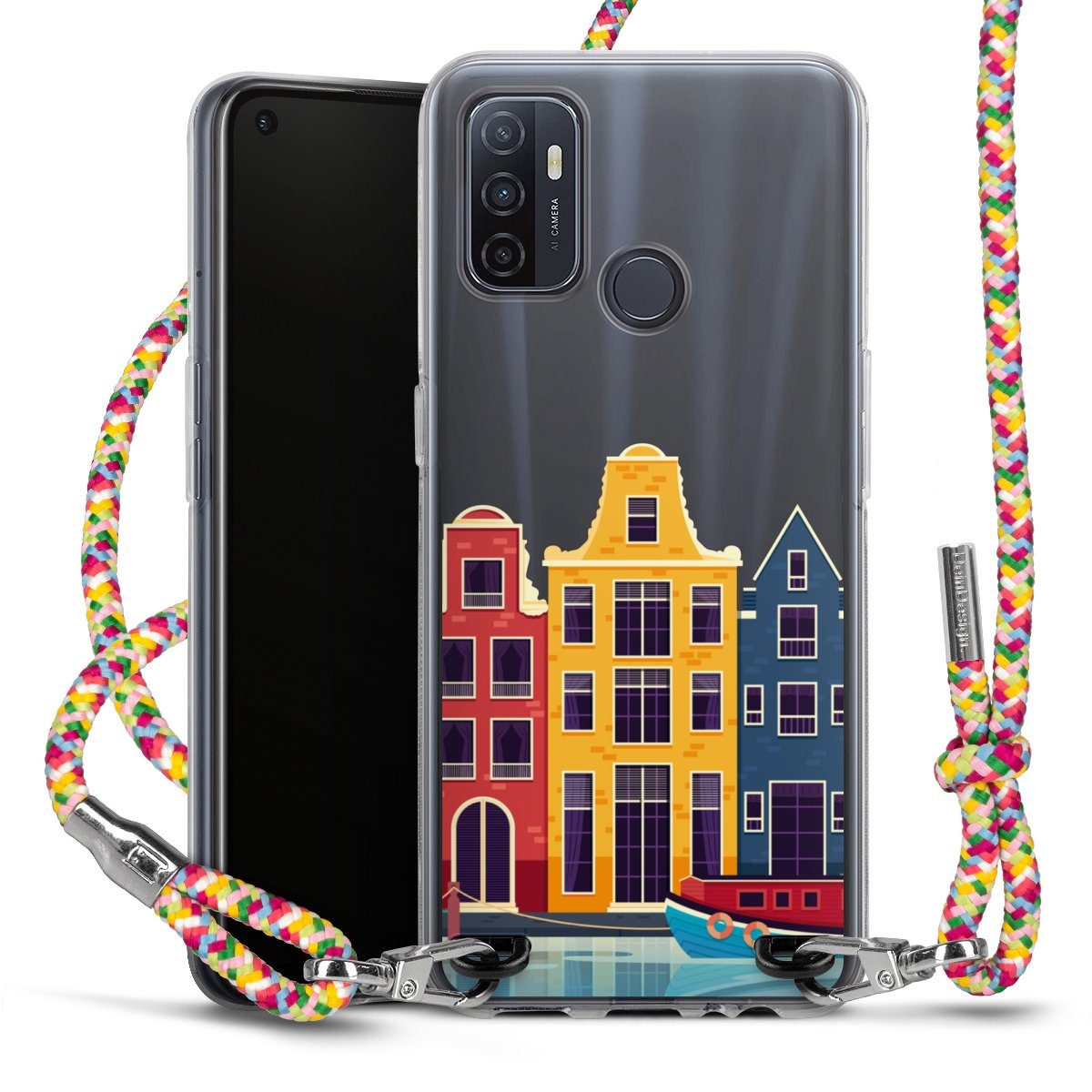 The flexible case is made from a highquality TPU material (thermoplastic Polyurethan). Thanks to its longlasting and break resistant characterisitcs, the case is flexible yet consistent in form and has a great grip and feel. The textile strap made from Polyester gives a chic yet casual accent allowing you to carry your phone like a bag or necklace - a practical gadget perfect for your next adventure. The textile strap is about 1.70 meters long and the length can easily be adjusted through the knots. Our Carry Case is available in Colourful, Mint-Camouflage, Very-Berry, Sahara-Sand and Sparkling-Neon. The ends of the textile strap are covered with metallic end caps to protect them against fraying.