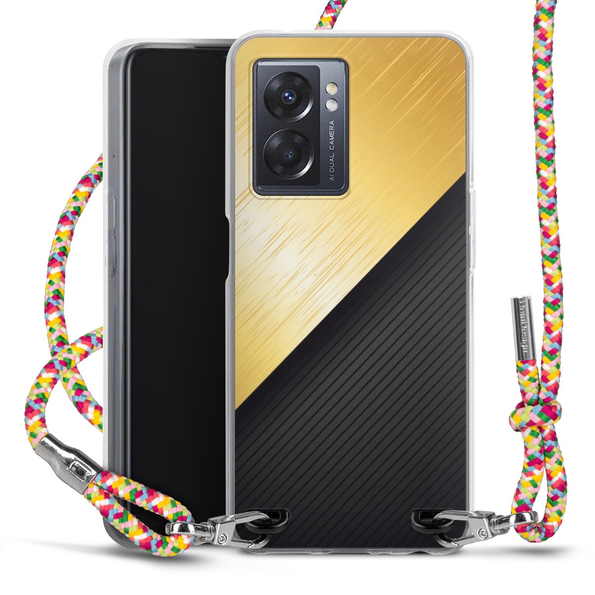 The flexible case is made from a highquality TPU material (thermoplastic Polyurethan). Thanks to its longlasting and break resistant characterisitcs, the case is flexible yet consistent in form and has a great grip and feel. The textile strap made from Polyester gives a chic yet casual accent allowing you to carry your phone like a bag or necklace - a practical gadget perfect for your next adventure. The textile strap is about 1.70 meters long and the length can easily be adjusted through the knots. Our Carry Case is available in Colourful, Mint-Camouflage, Very-Berry, Sahara-Sand and Sparkling-Neon. The ends of the textile strap are covered with metallic end caps to protect them against fraying.