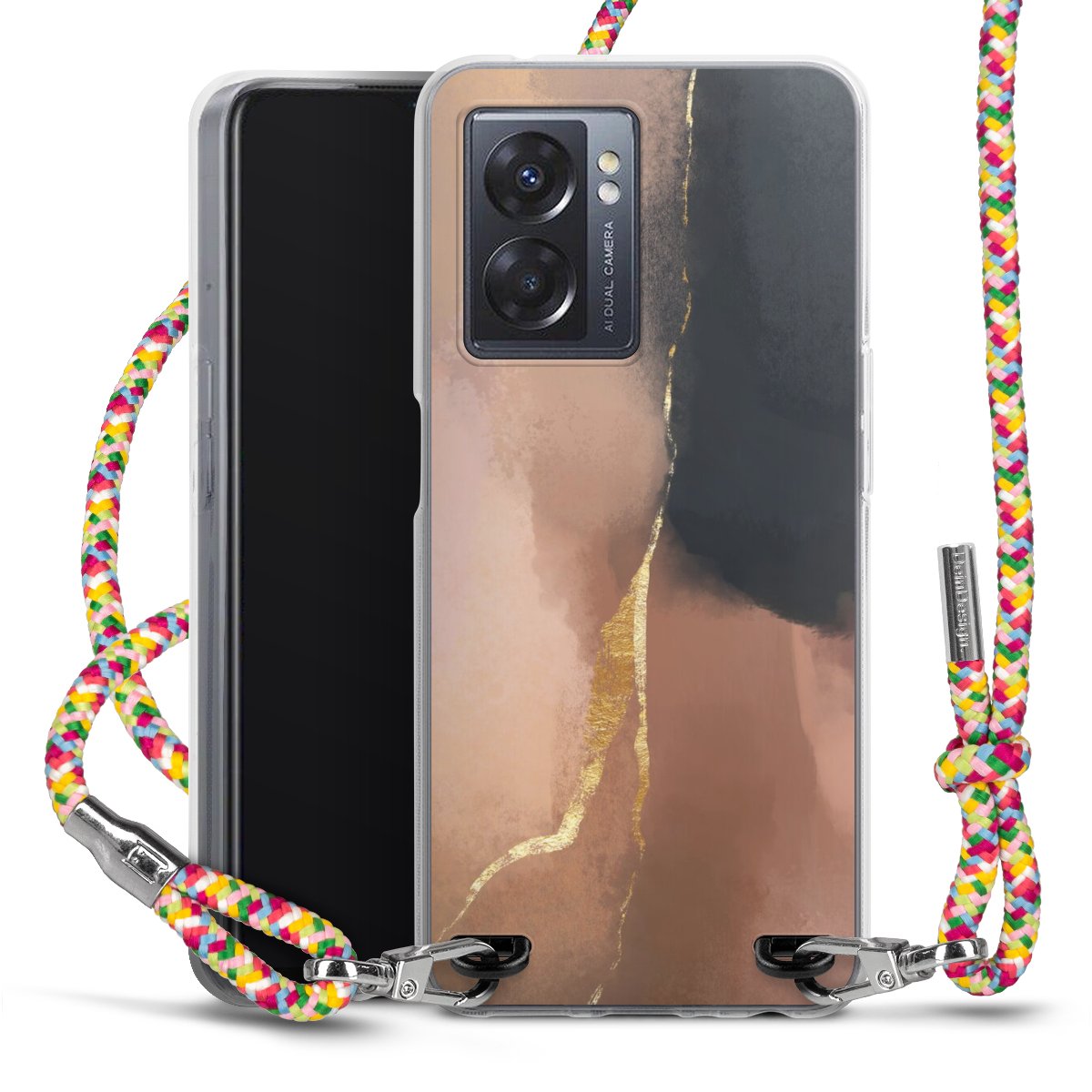 The flexible case is made from a highquality TPU material (thermoplastic Polyurethan). Thanks to its longlasting and break resistant characterisitcs, the case is flexible yet consistent in form and has a great grip and feel. The textile strap made from Polyester gives a chic yet casual accent allowing you to carry your phone like a bag or necklace - a practical gadget perfect for your next adventure. The textile strap is about 1.70 meters long and the length can easily be adjusted through the knots. Our Carry Case is available in Colourful, Mint-Camouflage, Very-Berry, Sahara-Sand and Sparkling-Neon. The ends of the textile strap are covered with metallic end caps to protect them against fraying.