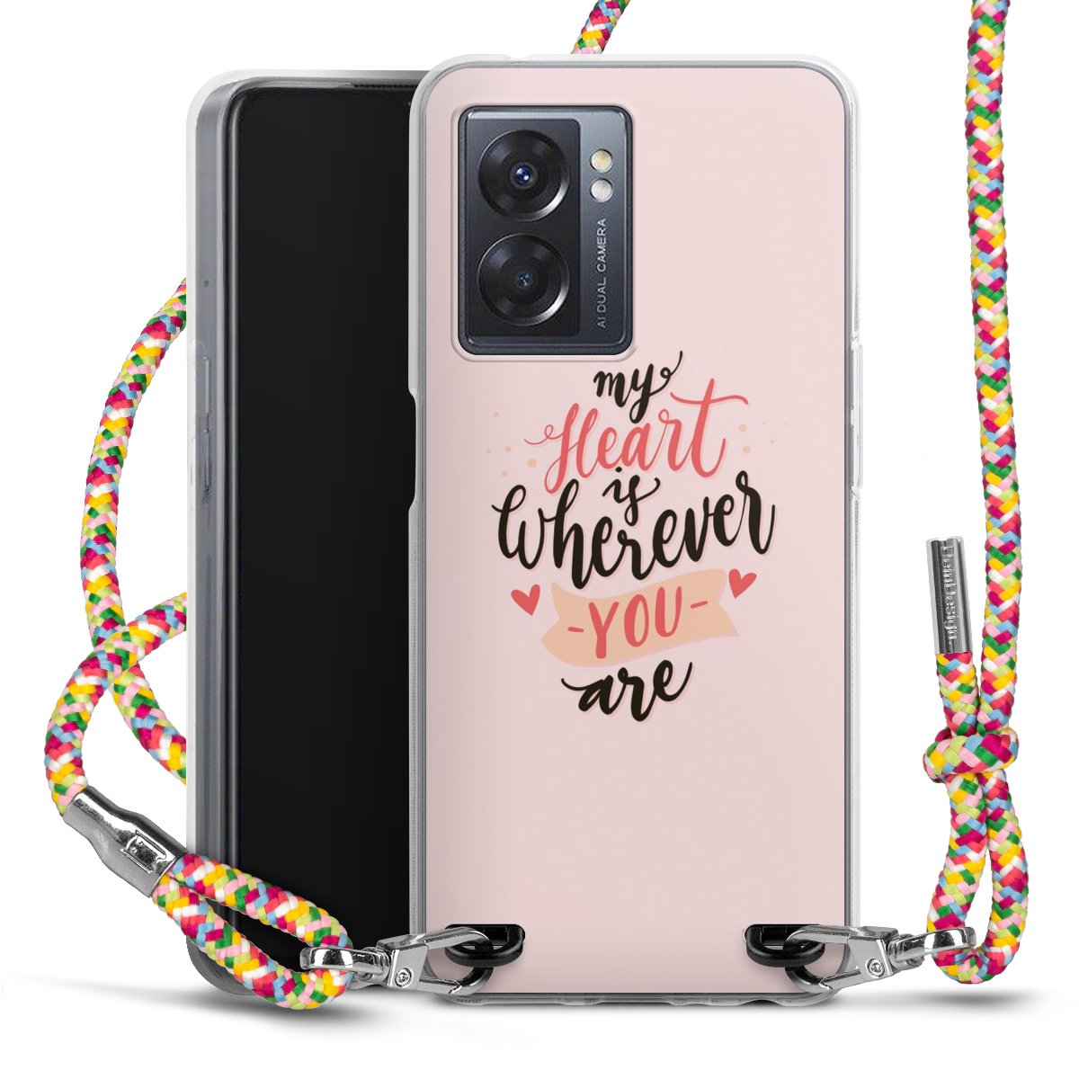 The flexible case is made from a highquality TPU material (thermoplastic Polyurethan). Thanks to its longlasting and break resistant characterisitcs, the case is flexible yet consistent in form and has a great grip and feel. The textile strap made from Polyester gives a chic yet casual accent allowing you to carry your phone like a bag or necklace - a practical gadget perfect for your next adventure. The textile strap is about 1.70 meters long and the length can easily be adjusted through the knots. Our Carry Case is available in Colourful, Mint-Camouflage, Very-Berry, Sahara-Sand and Sparkling-Neon. The ends of the textile strap are covered with metallic end caps to protect them against fraying.