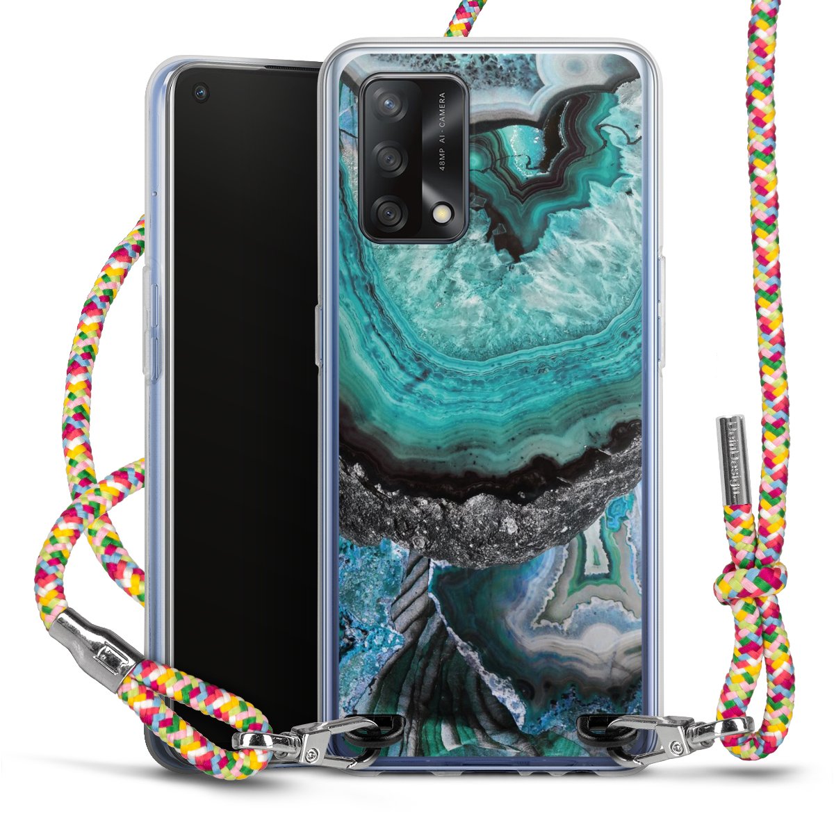 The flexible case is made from a highquality TPU material (thermoplastic Polyurethan). Thanks to its longlasting and break resistant characterisitcs, the case is flexible yet consistent in form and has a great grip and feel. The textile strap made from Polyester gives a chic yet casual accent allowing you to carry your phone like a bag or necklace - a practical gadget perfect for your next adventure. The textile strap is about 1.70 meters long and the length can easily be adjusted through the knots. Our Carry Case is available in Colourful, Mint-Camouflage, Very-Berry, Sahara-Sand and Sparkling-Neon. The ends of the textile strap are covered with metallic end caps to protect them against fraying.
