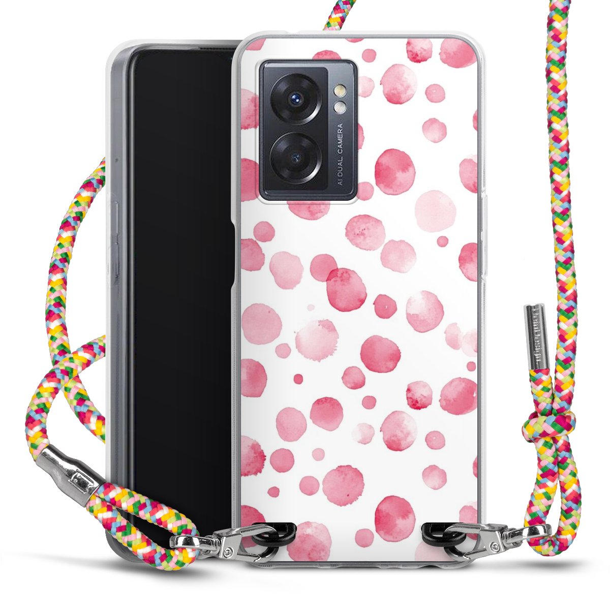 The flexible case is made from a highquality TPU material (thermoplastic Polyurethan). Thanks to its longlasting and break resistant characterisitcs, the case is flexible yet consistent in form and has a great grip and feel. The textile strap made from Polyester gives a chic yet casual accent allowing you to carry your phone like a bag or necklace - a practical gadget perfect for your next adventure. The textile strap is about 1.70 meters long and the length can easily be adjusted through the knots. Our Carry Case is available in Colourful, Mint-Camouflage, Very-Berry, Sahara-Sand and Sparkling-Neon. The ends of the textile strap are covered with metallic end caps to protect them against fraying.