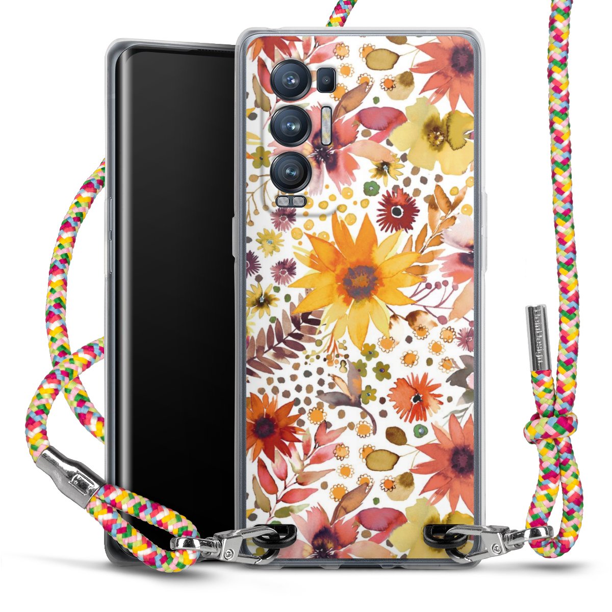 The flexible case is made from a highquality TPU material (thermoplastic Polyurethan). Thanks to its longlasting and break resistant characterisitcs, the case is flexible yet consistent in form and has a great grip and feel. The textile strap made from Polyester gives a chic yet casual accent allowing you to carry your phone like a bag or necklace - a practical gadget perfect for your next adventure. The textile strap is about 1.70 meters long and the length can easily be adjusted through the knots. Our Carry Case is available in Colourful, Mint-Camouflage, Very-Berry, Sahara-Sand and Sparkling-Neon. The ends of the textile strap are covered with metallic end caps to protect them against fraying.