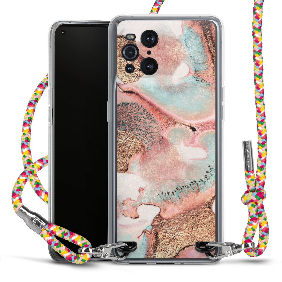 The flexible case is made from a highquality TPU material (thermoplastic Polyurethan). Thanks to its longlasting and break resistant characterisitcs, the case is flexible yet consistent in form and has a great grip and feel. The textile strap made from Polyester gives a chic yet casual accent allowing you to carry your phone like a bag or necklace - a practical gadget perfect for your next adventure. The textile strap is about 1.70 meters long and the length can easily be adjusted through the knots. Our Carry Case is available in Colourful, Mint-Camouflage, Very-Berry, Sahara-Sand and Sparkling-Neon. The ends of the textile strap are covered with metallic end caps to protect them against fraying.