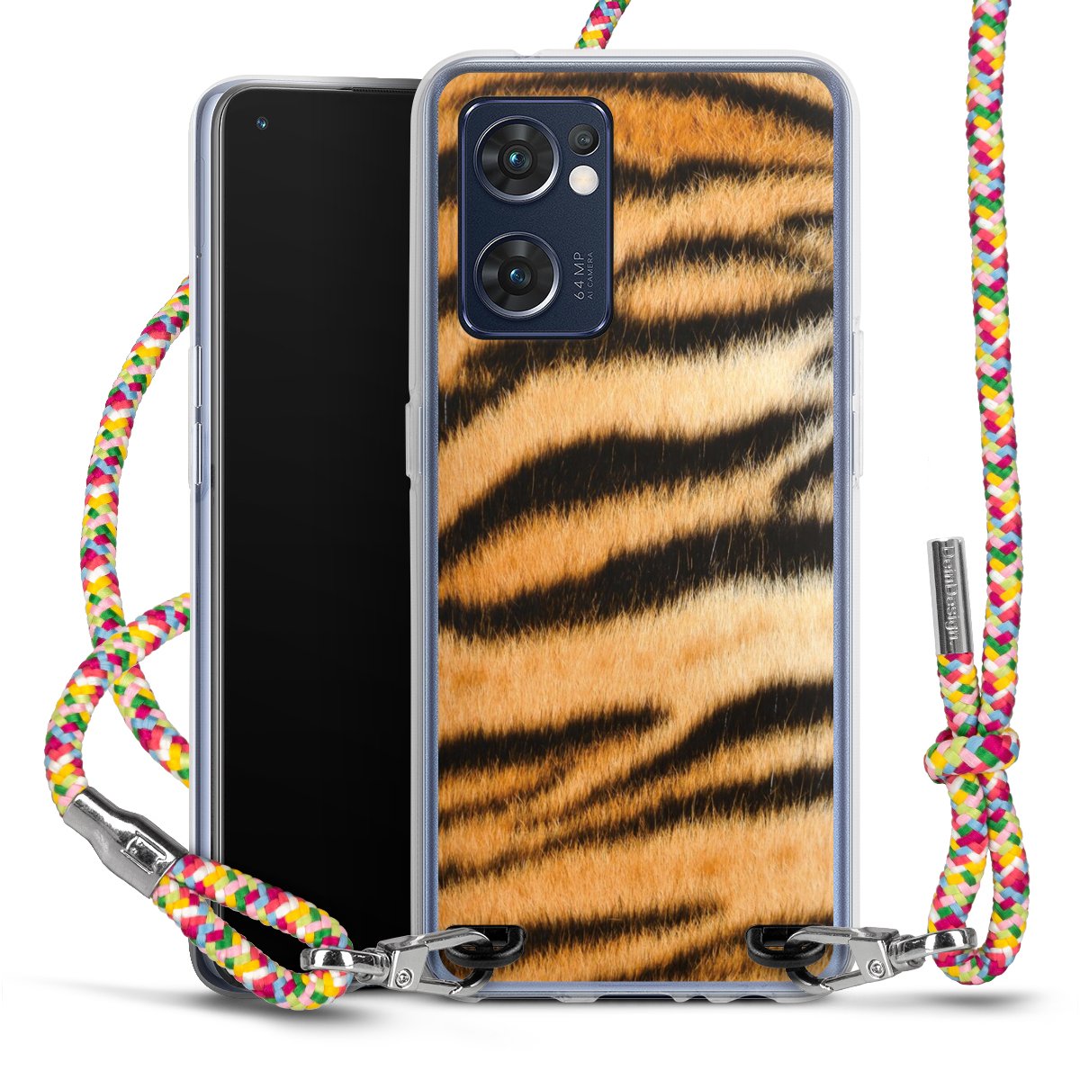 The flexible case is made from a highquality TPU material (thermoplastic Polyurethan). Thanks to its longlasting and break resistant characterisitcs, the case is flexible yet consistent in form and has a great grip and feel. The textile strap made from Polyester gives a chic yet casual accent allowing you to carry your phone like a bag or necklace - a practical gadget perfect for your next adventure. The textile strap is about 1.70 meters long and the length can easily be adjusted through the knots. Our Carry Case is available in Colourful, Mint-Camouflage, Very-Berry, Sahara-Sand and Sparkling-Neon. The ends of the textile strap are covered with metallic end caps to protect them against fraying.