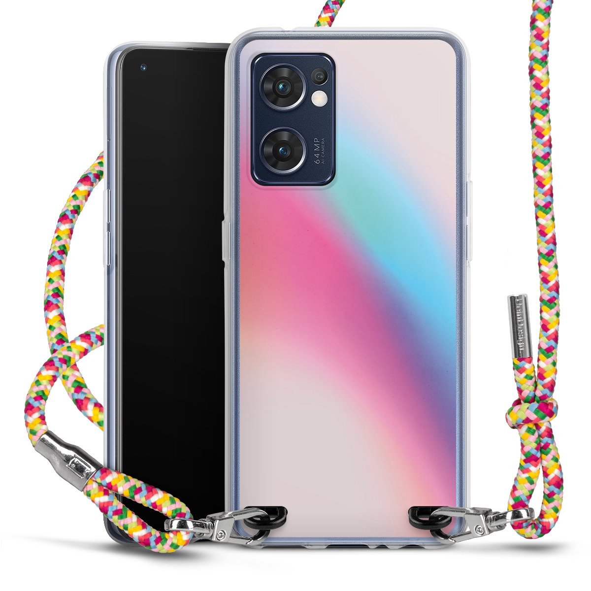 The flexible case is made from a highquality TPU material (thermoplastic Polyurethan). Thanks to its longlasting and break resistant characterisitcs, the case is flexible yet consistent in form and has a great grip and feel. The textile strap made from Polyester gives a chic yet casual accent allowing you to carry your phone like a bag or necklace - a practical gadget perfect for your next adventure. The textile strap is about 1.70 meters long and the length can easily be adjusted through the knots. Our Carry Case is available in Colourful, Mint-Camouflage, Very-Berry, Sahara-Sand and Sparkling-Neon. The ends of the textile strap are covered with metallic end caps to protect them against fraying.